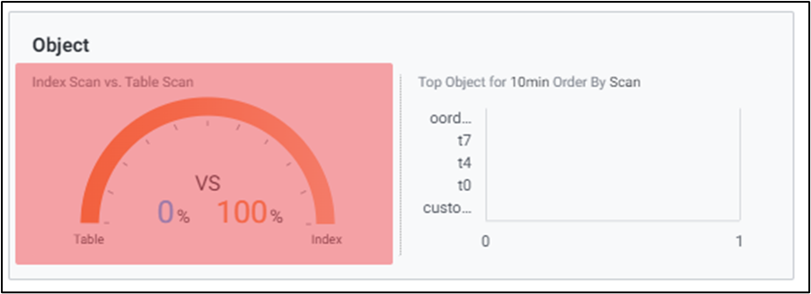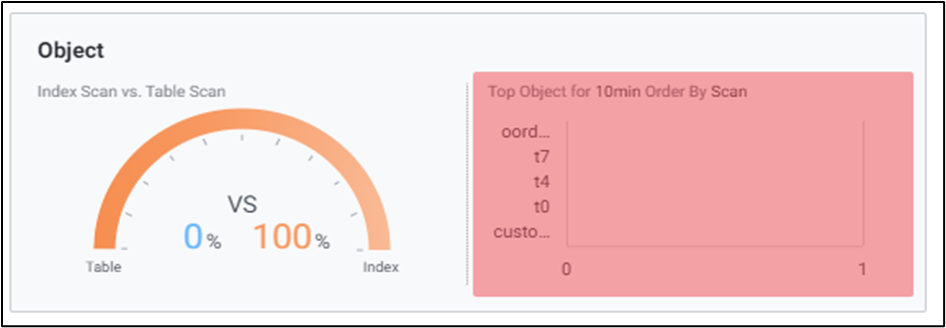 GaugeChart를 클릭 시 Object 정보를 확인할 수 있는 ‘Top 10 Object List’ 팝업창으로 연계됩니다. ‘Top 10 Object List’ 팝업을 통해 Table Full Scan 비율이 높은 Object를 확인할 수 있습니다. 우측 상단에서 정렬 조건을 변경할 수 있습니다.