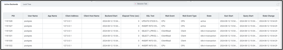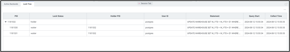 현재 Lock 상태의 Backends 목록을 확인할 수 있습니다. (상세 내용은 11-2) Lock Tree 참고)