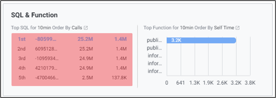 최근 10분 데이터를 비교하여 기본 실행 횟수의 변화량을 기준으로 Top SQL과 Top Function을 확인할 수 있습니다.