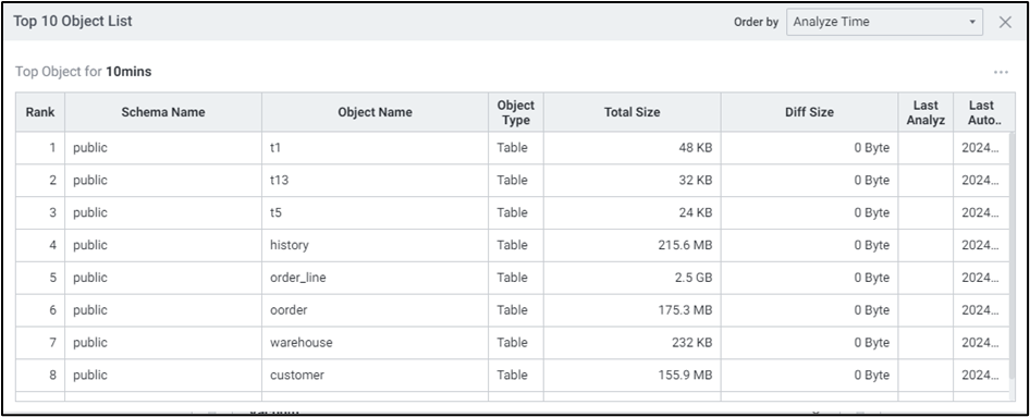 더블 클릭 시 ‘Top 10 Object List’ 팝업창으로 연계되어 분석시간이 오래된 Object 목록을 확인할 수 있습니다.