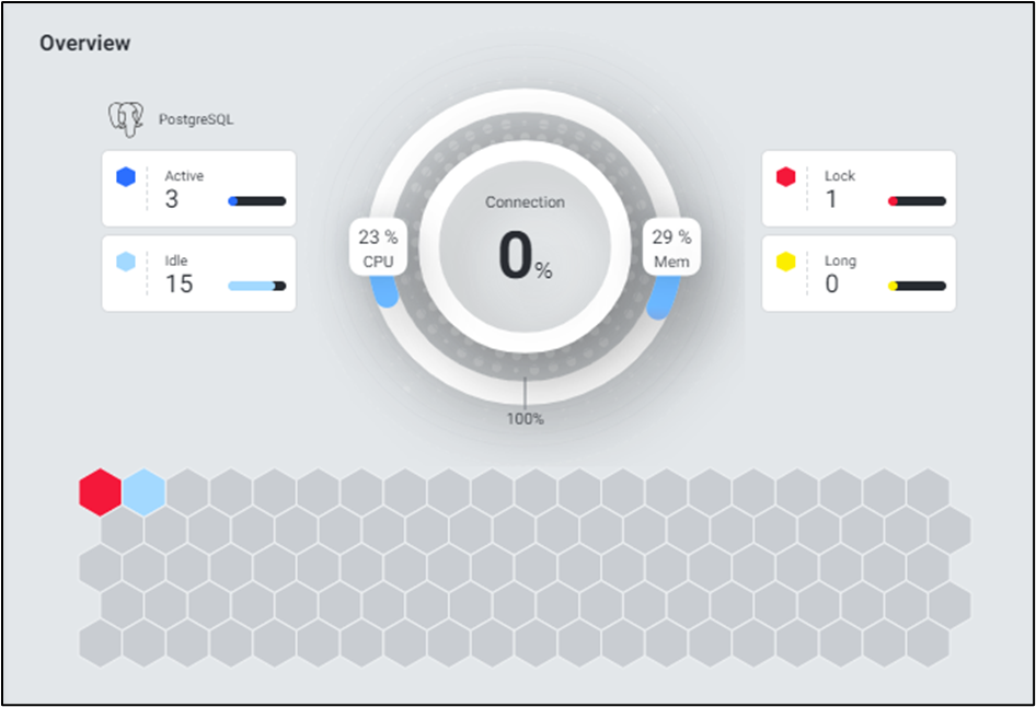 Connection View를 통해 데이터베이스의 전체 Backends가 어떻게 사용되고 있는지 사용 비율을 표현한 벌집 뷰의 색 변화를 통해 데이터베이스의 상태를 한눈에 파악할 수 있습니다. 또한 max_connection 대비 Backends가 얼마나 사용 중인지 확인할 수 있습니다.