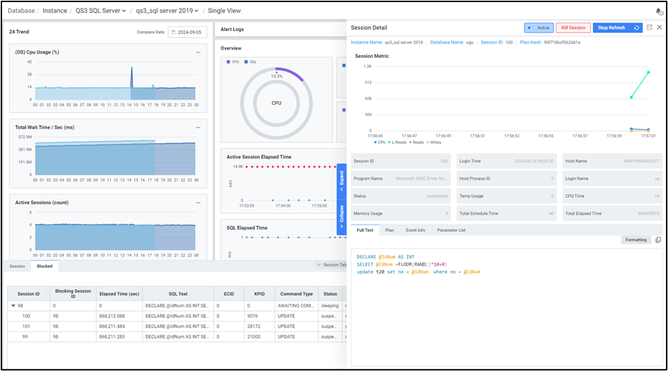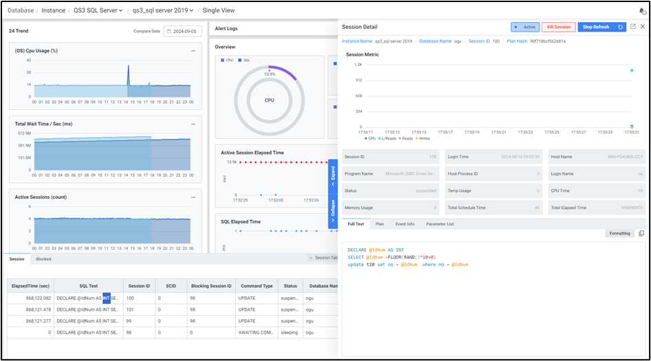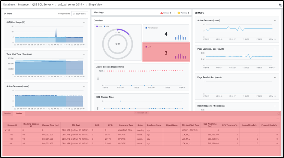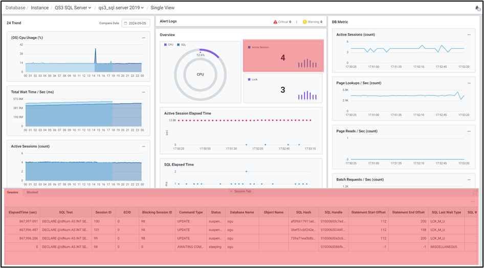 OS, 데이터베이스의 CPU 사용율과 Session 상태 및 수행 시간에 따른 상태를 확인할 수 있습니다.