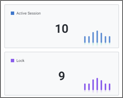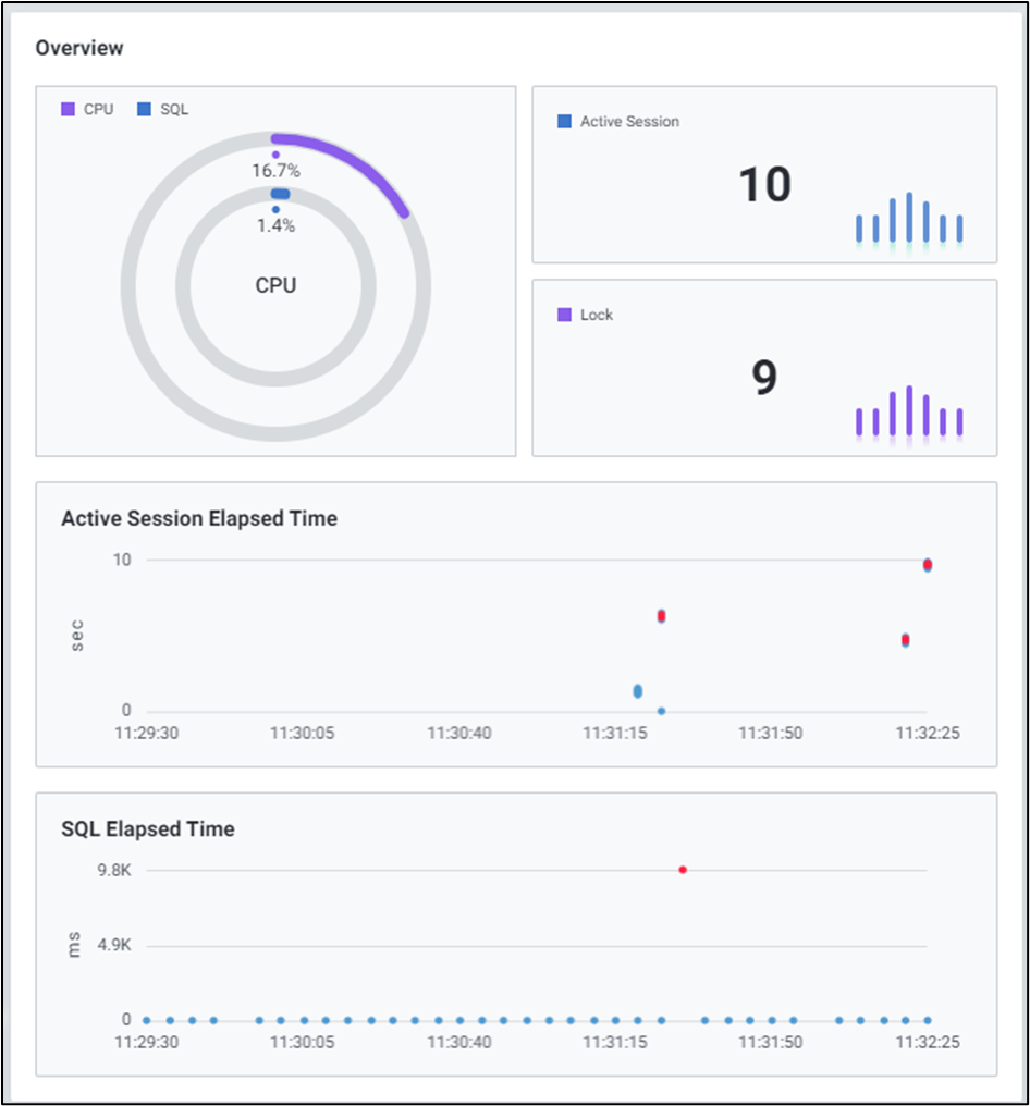 데이터베이스의 활동성 및 지연에 관한 지표들을 이용하여 Chart 형식의 모니터링 화면을 제공합니다. 기본적으로 5개의 주요 성능 지표에 대한 모니터링이 가능하며, 시스템 및 업무 특성에 따라 원하는 성능지표로 변경 및 확장이 가능합니다.
