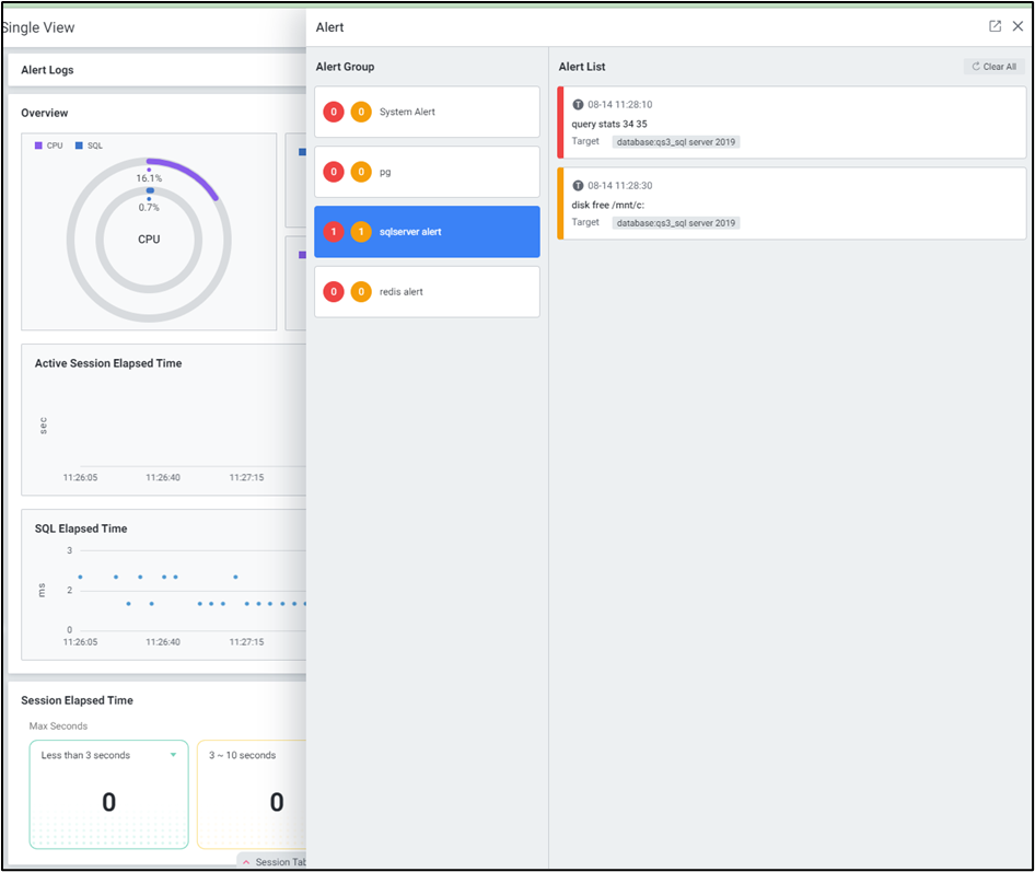 | 3 | Alert Logs | 현재 Alert 이 발생하고 있는 알람 발생 카운트를 표시합니다. 해당 영역을 클릭하면 Alert 발생 정보를 확인할 수 있는 Alert List 화면이 펼쳐집니다. |
