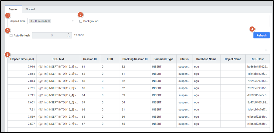 | 4 | Stop Refresh | 5초 주기로 세션 정보를 조회합니다. 클릭 시 조회를 중지합니다. |