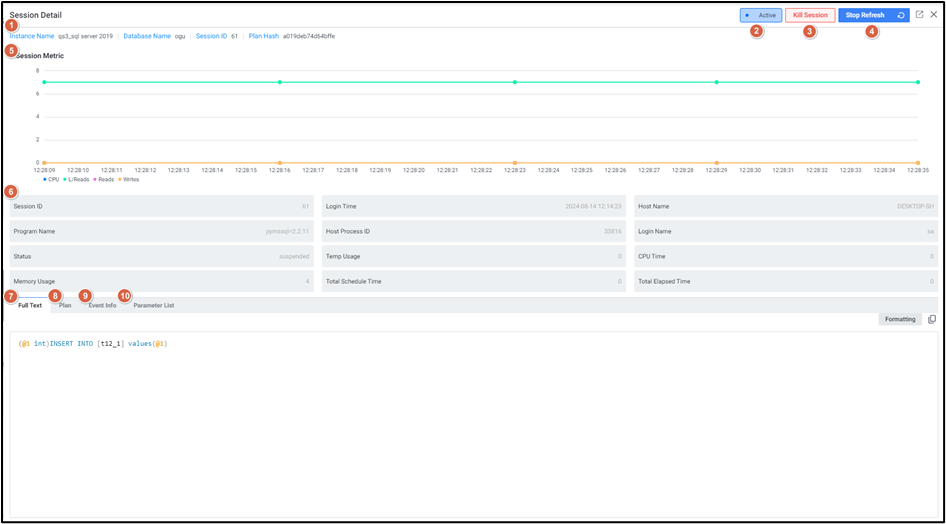 | 5 | 성능 지표 | 세션 정보를 차트로 제공합니다. 제공 지표 cpu time: 세션에서 사용하는 CPU 시간 reads: 세션의 요청에 의해 수행된 읽기 수 writes: 세션의 요청에 의해 수행된 쓰기 수 logical reads: 세션의 요청에 의해 수행된 논리적 읽기 수 |