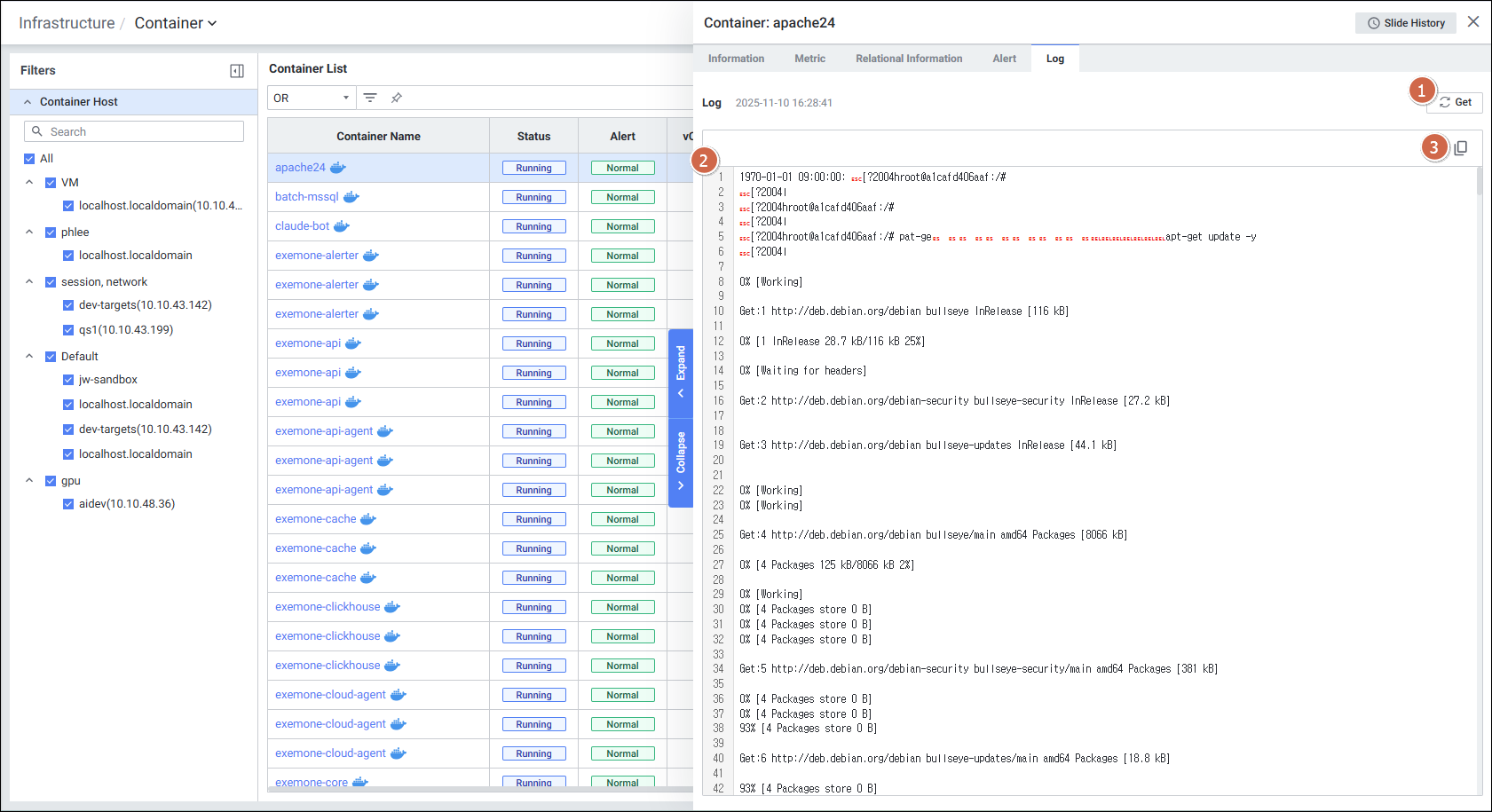 1Get 클릭 시 Container Log 데이터를 가져옵니다.