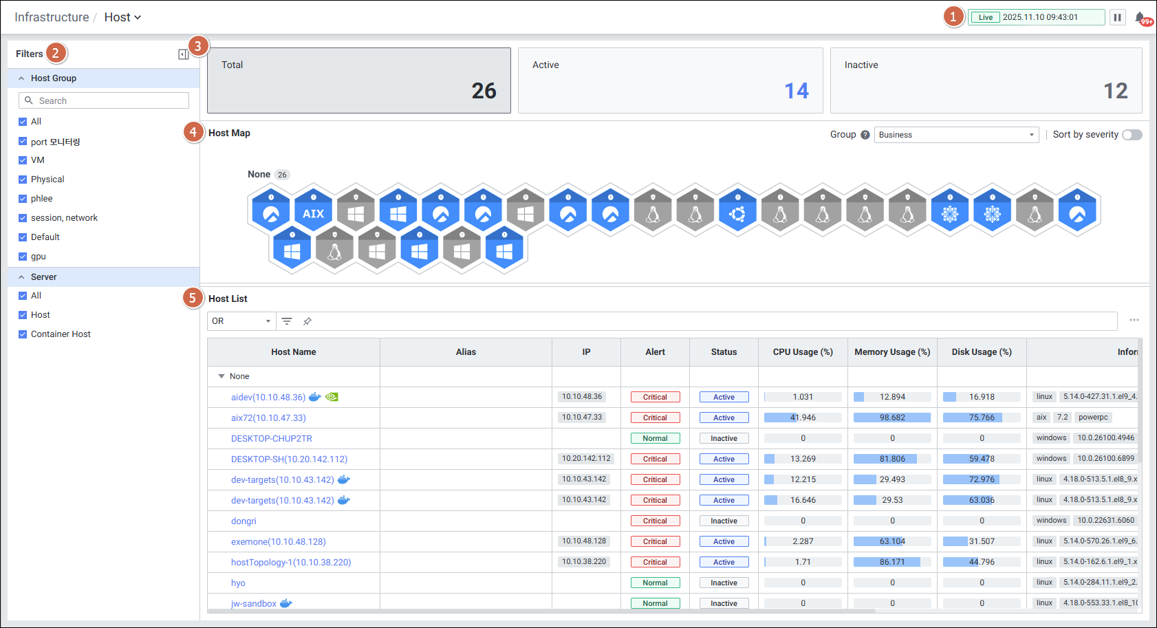 | 4 | Host Map | 모니터링 대상 별 상태를 헥사 맵으로 보여줍니다. |