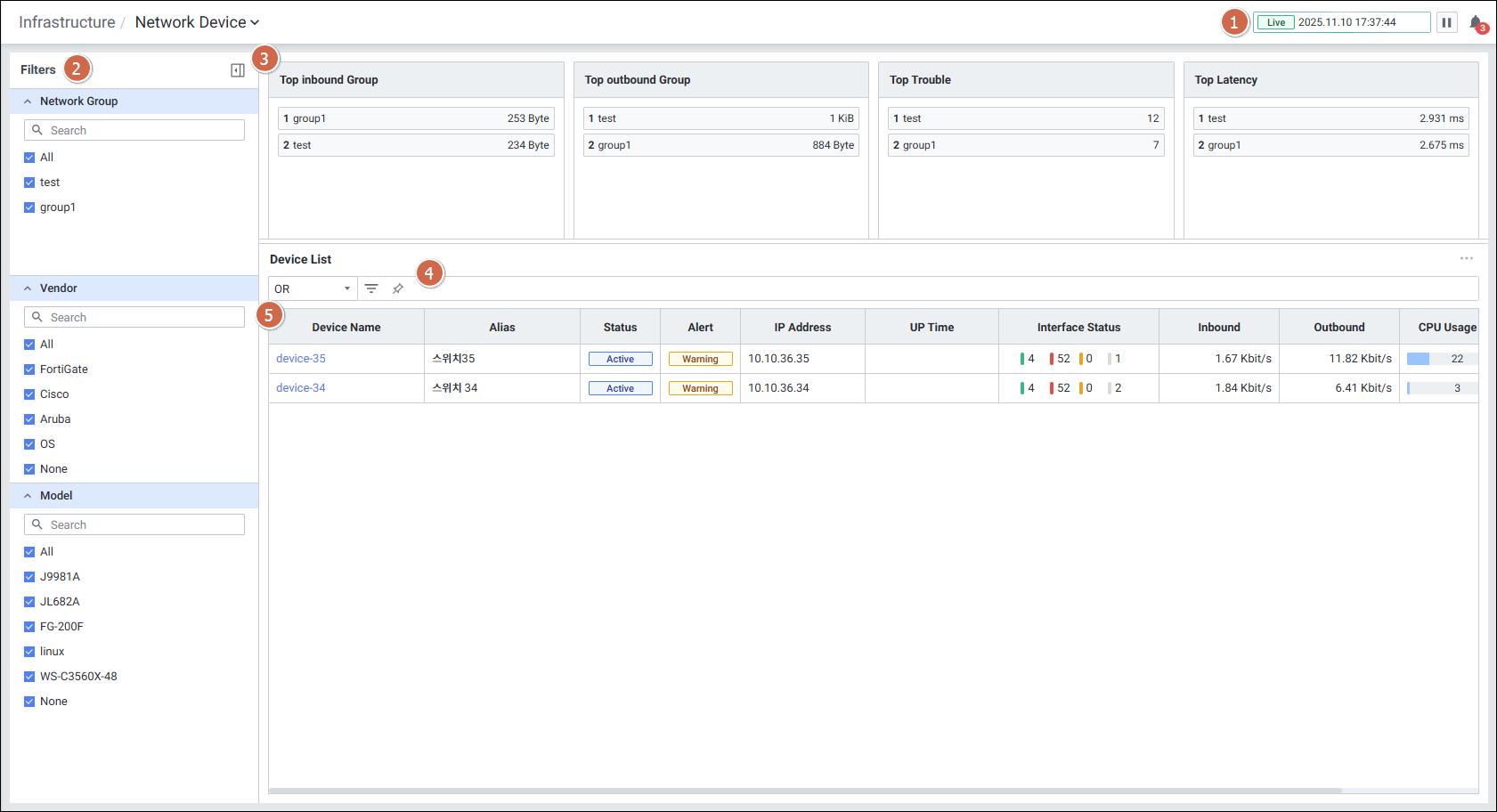 | 5 | Device List | Network Device의 목록을 보여줍니다. |