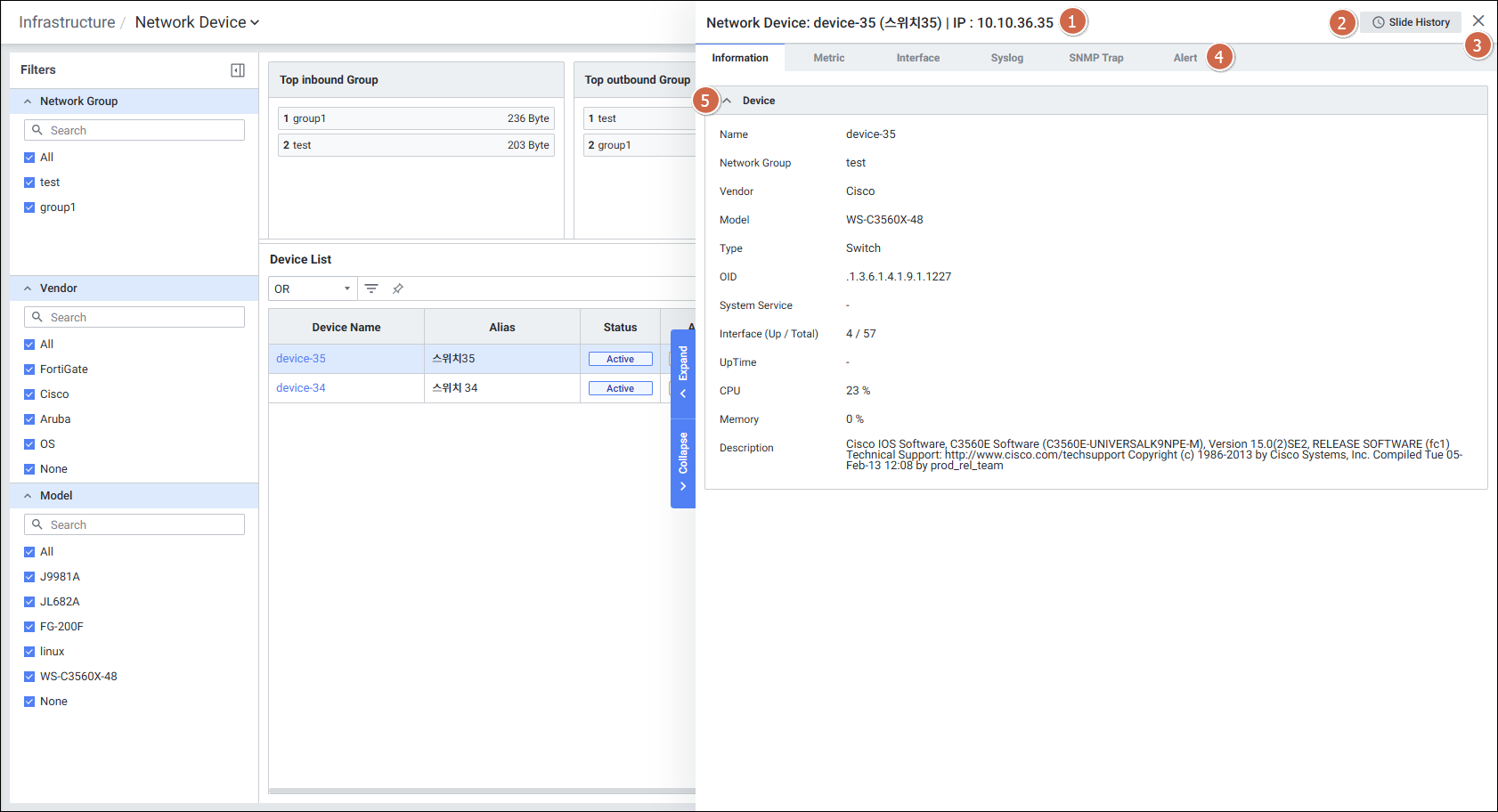 | 4 | Tab | Network Deivce 타입별 탭 클릭 시 해당 탭의 Detail Slide 화면을 보여줍니다. Information Metric Interface Syslog SNMP Trap Alert |