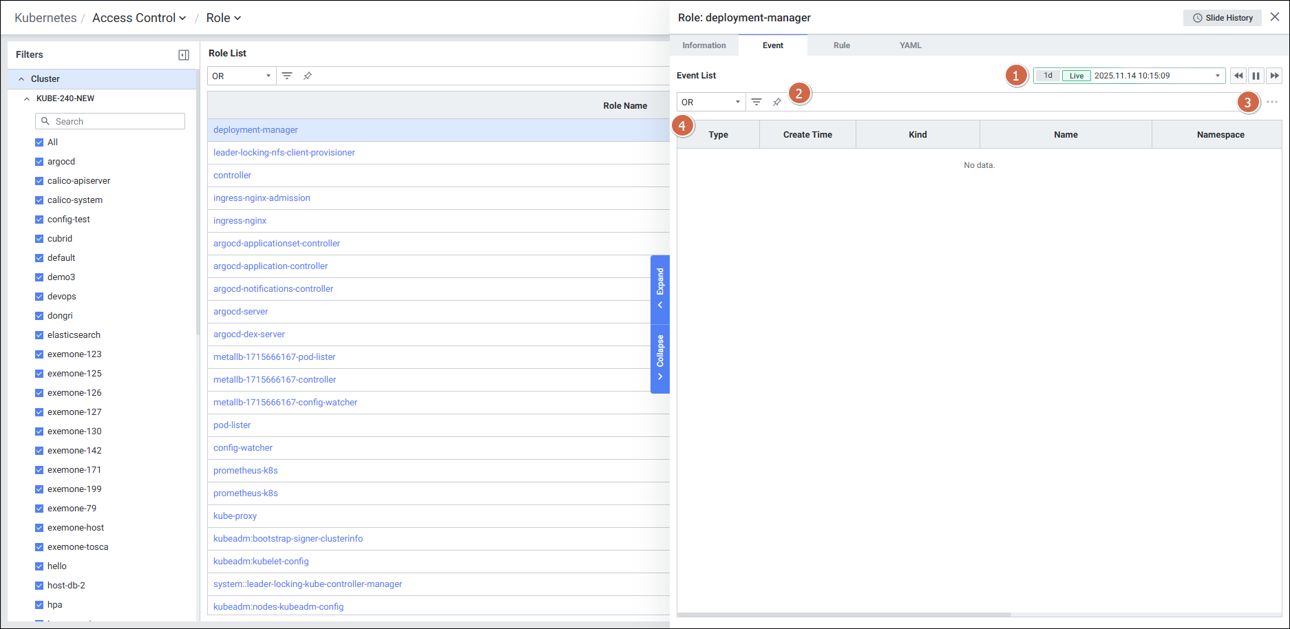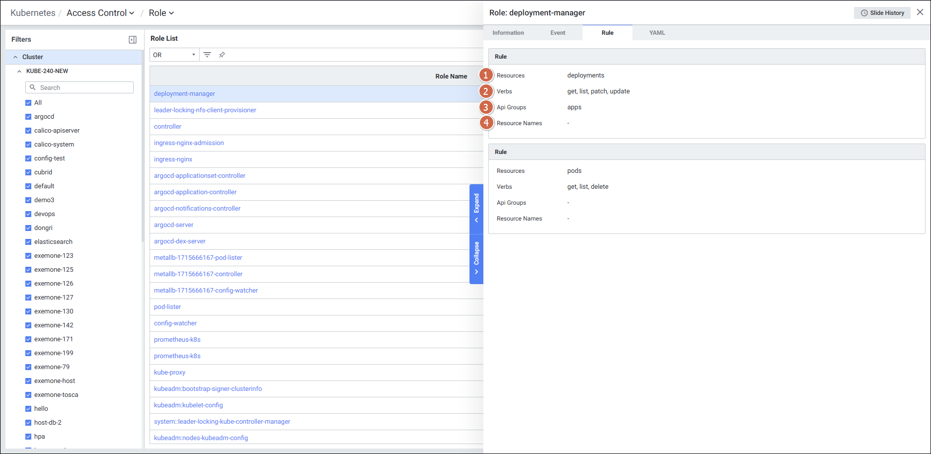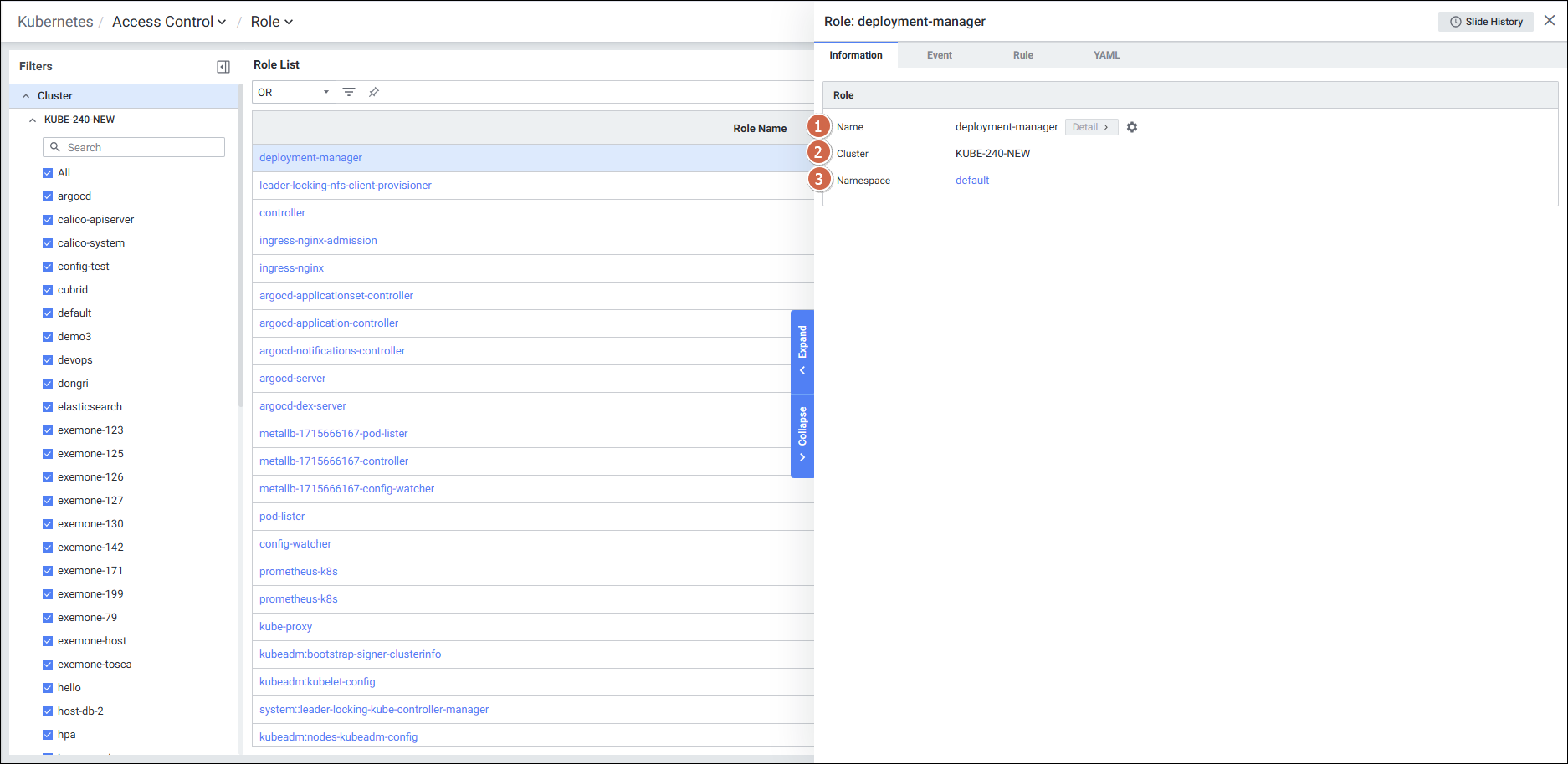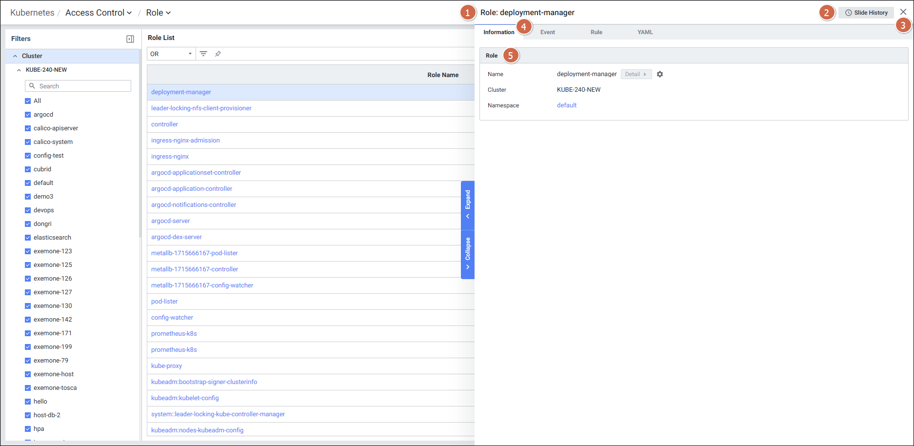 | 4 | Tab | 탭 클릭 시 해당 탭의 디테일 슬라이드 화면을 보여줍니다. Information Event Rule YAML |