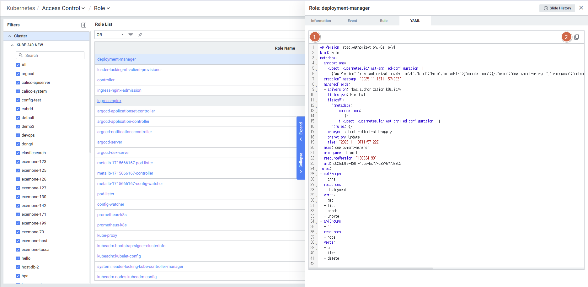 Role 디테일 슬라이드의 YAML을 확인하는 화면입니다.