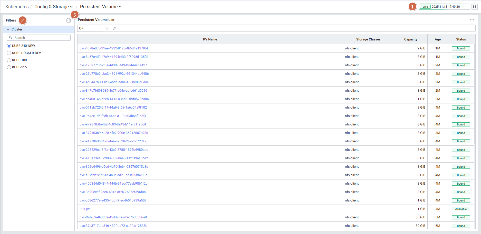 | 2 | Filters | Persistent Volume 화면의 필터 항목을 선택합니다. |