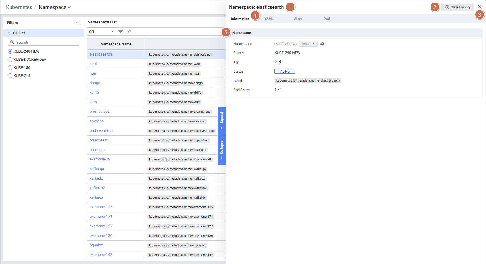 | 4 | Tab | 탭 클릭 시 해당 탭의 디테일 슬라이드 화면을 보여줍니다. Information YAML Alert Pod |