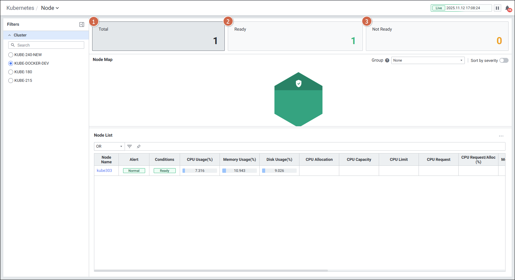 클릭 시 Node Map과 노드 목록에서 Not Ready 상태인 노드를 보여줍니다.