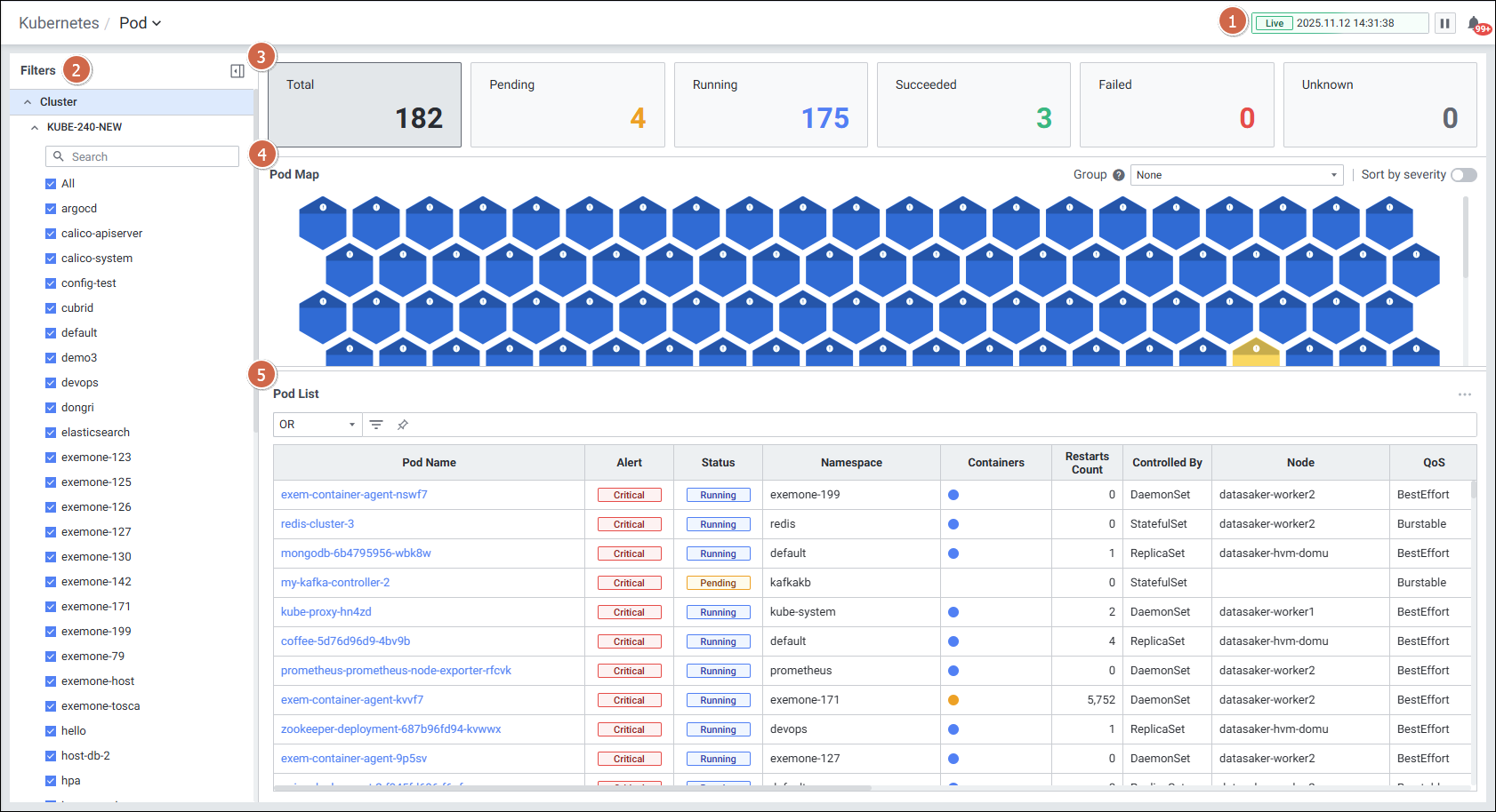 | 2 | Filters | 파드 화면의 필터 항목을 선택합니다. |