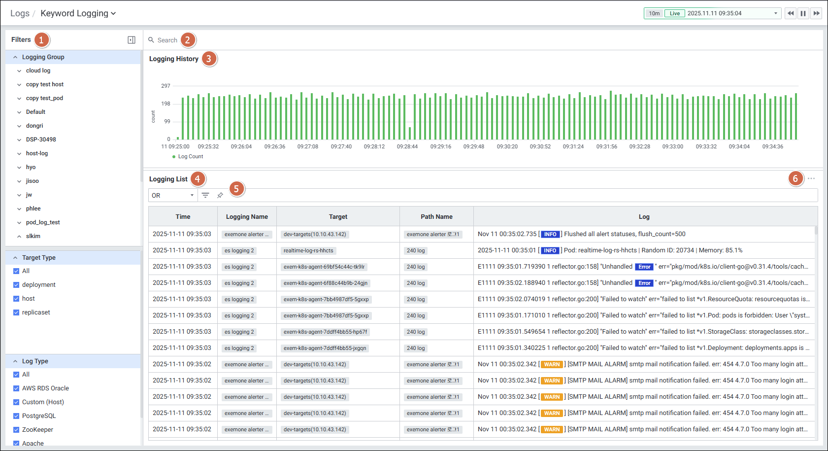 | 4 | Logging List | Keyword에 해당하는 로그 정보를 출력합니다. Log 컬럼 데이터 클릭 시, 해당 로그 메시지 상세 화면이 출력됩니다. |