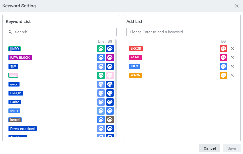 설정한 Keyword가 출력된 로그를 출력합니다.