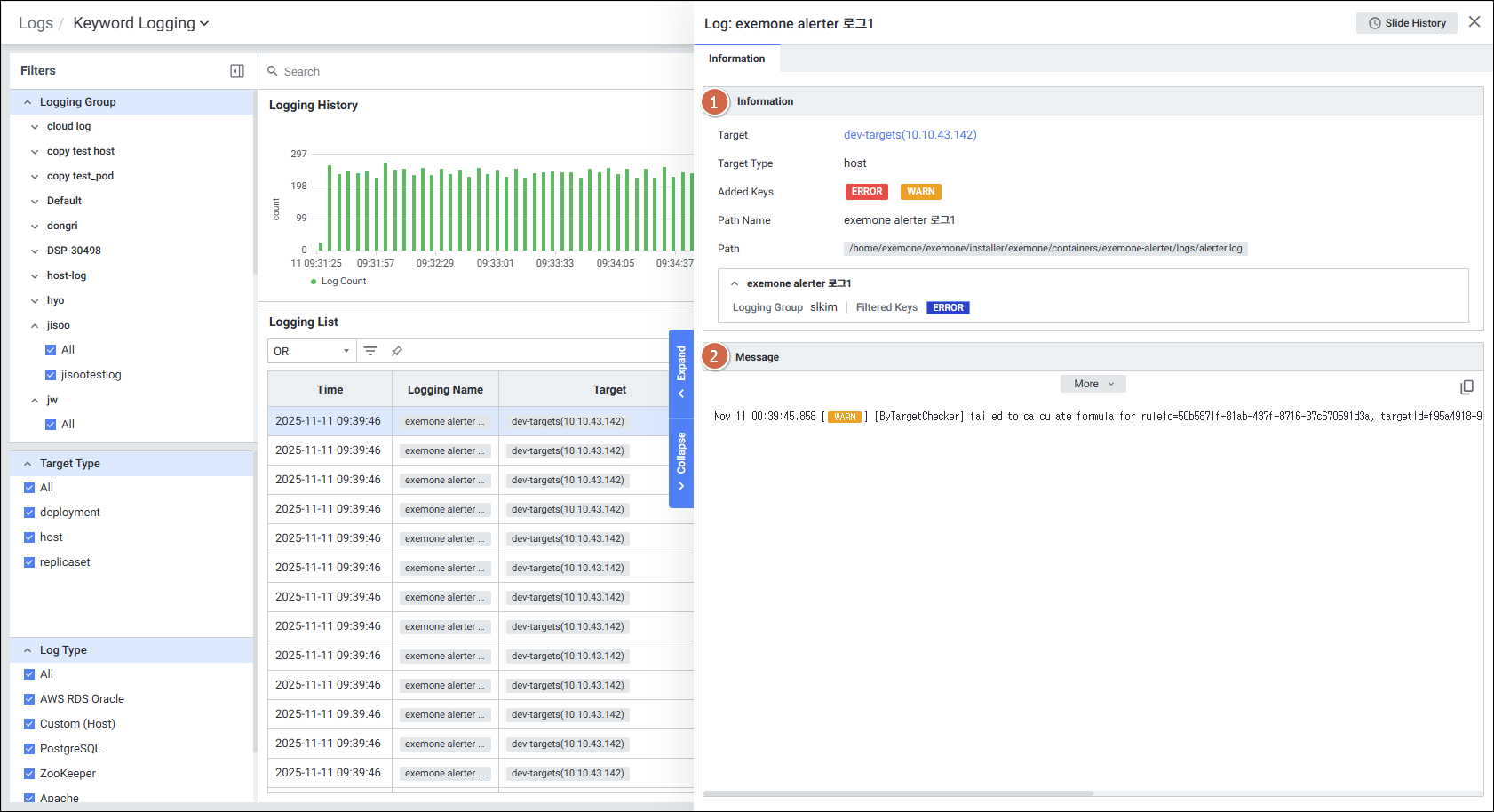 | 2 | Message | 로그 메세지 내용을 보여줍니다. 더보기 버튼 클릭 시, 생략 된 로그 내용이 출력됩니다. |