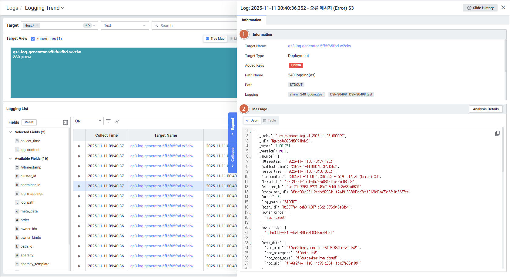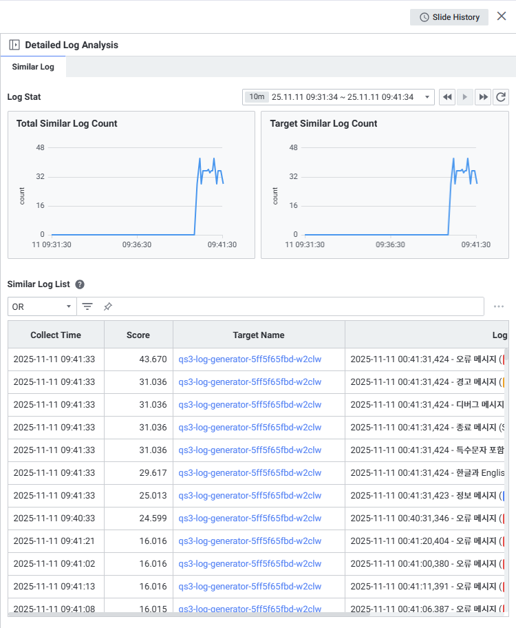 | 2 | Message | 로그 메세지 내용을 보여줍니다. Analysis Details버튼 클릭 시, Log를 분석한 디테일 화면을 보여줍니다. ![]() |