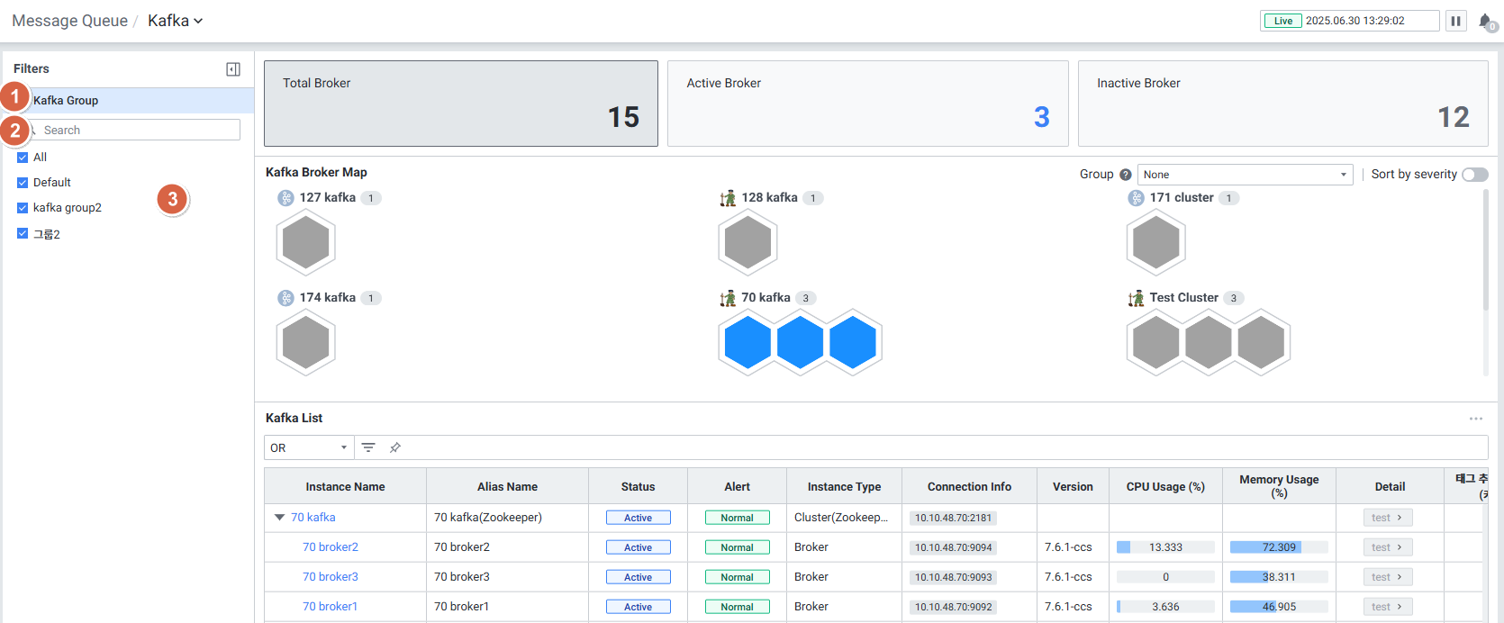 | 3 | Filter Item | 항목을 전체 선택한 상태로 보여줍니다. 필터 항목 선택에 따라 Kafka 화면을 보여줍니다. 클릭 시 필터 항목을 접힌 상태로 보여줍니다. |