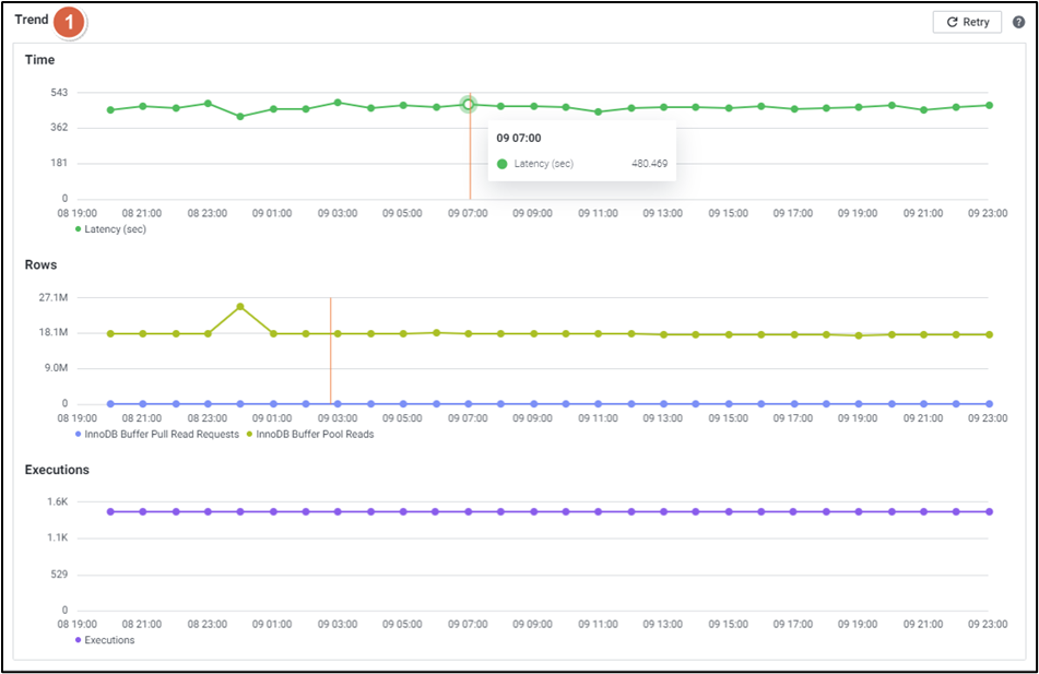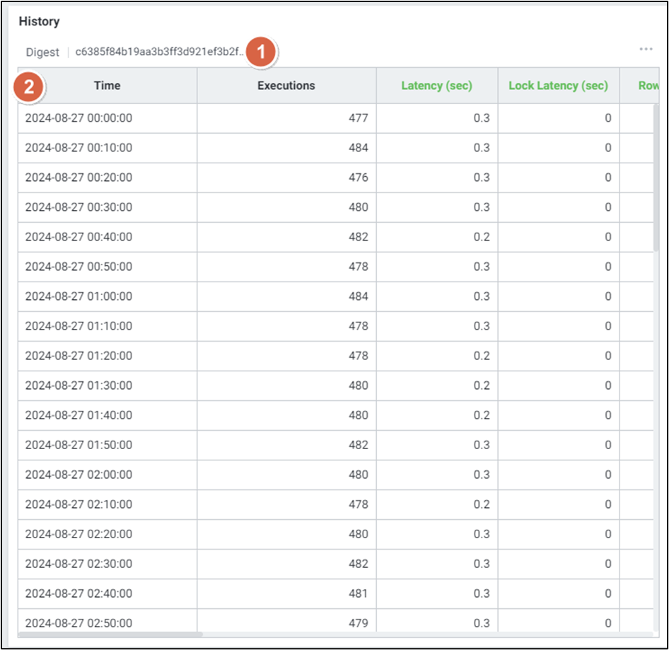 | 1 | Grid | Latency Time 기준 Top-1 SQL이 자동 선택되며, 3가지 주요 지표를 Trend 영역에 보여줍니다. 다른 SQL을 클릭할 경우 Trend 영역의 값이 함께 변경되며, 선택한 SQL ID 값이 History 영역 하단에 출력됩니다. |