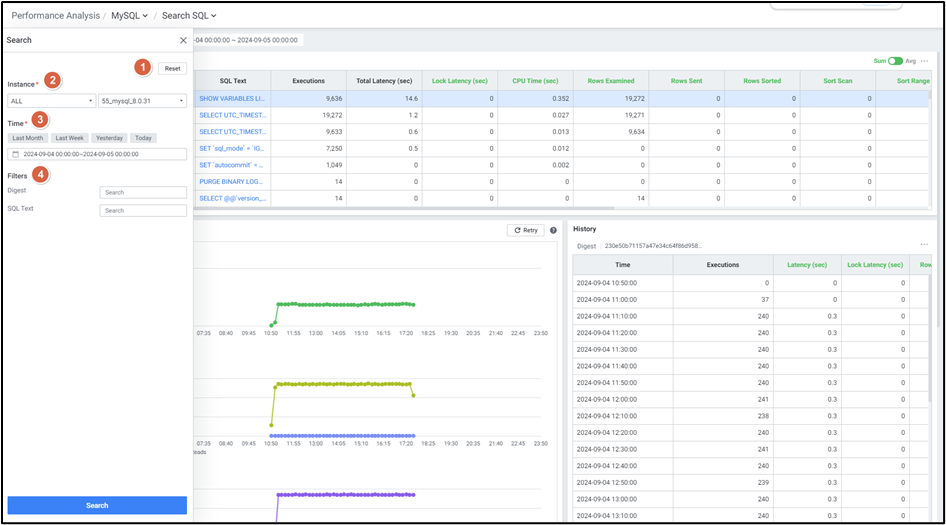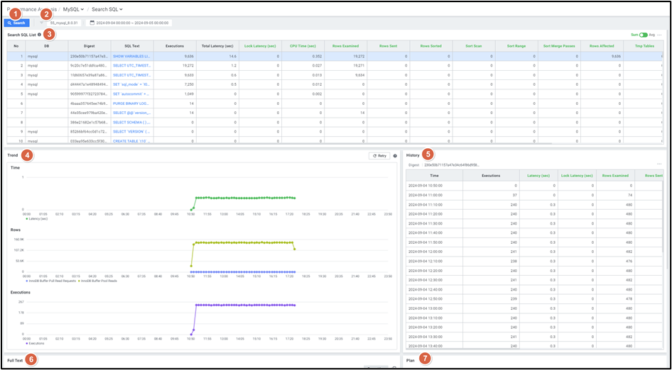 | 3 | Search SQL List | 구간별 사용된 SQL의 통계값을 보여주며, Latency, Lock Latency, Rows Examined 등 다양한 SQL의 자원 사용량을 제공합니다 |