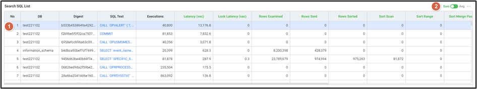 | 2 | Toggle | 우측 상단 토글 버튼 클릭을 통해 합계, 평균으로 변환할 수 있습니다. Latency (sec) Lock Latency (sec) Rows Examined Rows Sent Rows Sorted Sort Scan Sort Range Sort Merge Passes Rows Affected Tmp Tables Tmp Disk Tables Error Count Sum No index Used (count) Sum No Good index Used (count) |