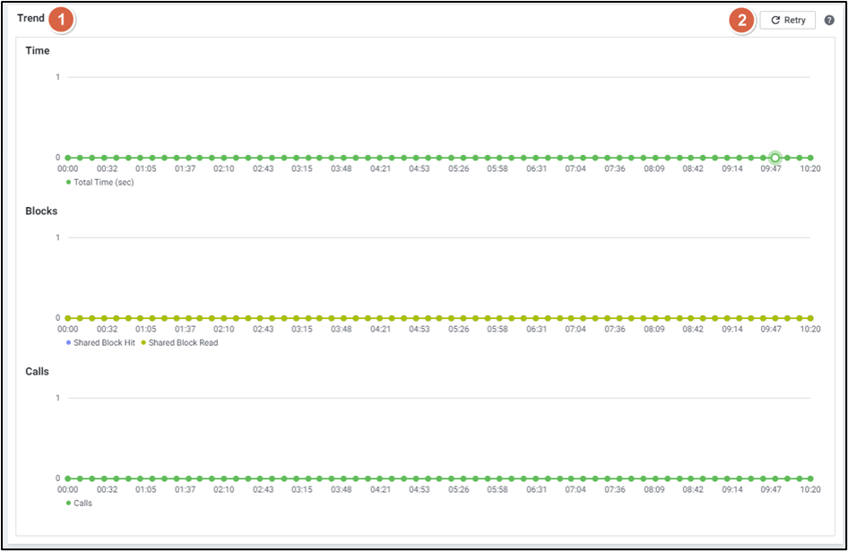 | 1 | Chart | Time : 조회한 SQL ID의 Time에 대한 추이를 나타냅니다. Blocks : 조회한 SQL ID의 Blocks에 대한 추이를 나타냅니다. Calls : 조회한 SQL ID의 Calls에 대한 추이를 나타냅니다. |