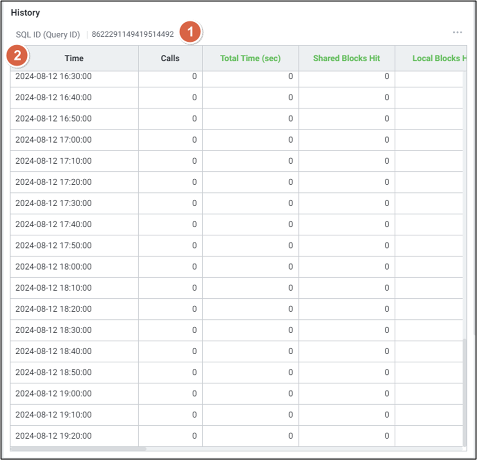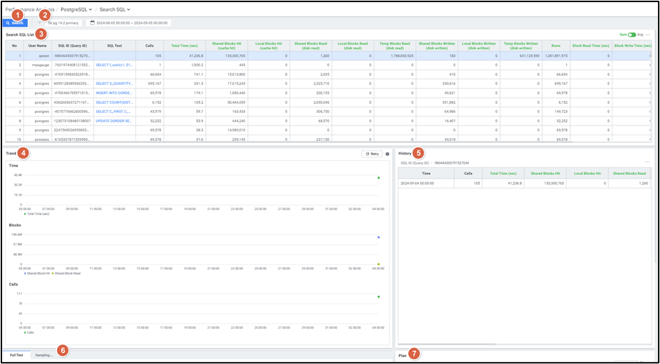 | 1 | Grid | Total Time 기준 Top-1 SQL이 자동 선택 되며, 3가지 주요 지표를 Trend 영역에 보여줍니다. 다른 SQL을 클릭할 경우 Trend 영역의 값이 함께 변경되며, 선택한 SQL ID 값이 History 영역 하단에 출력됩니다. |