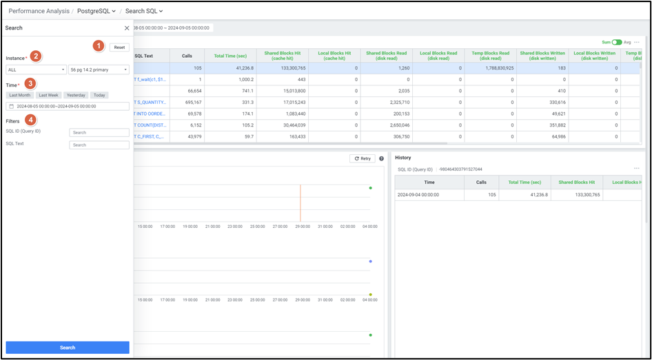 | 4 | Filters | 검색 조건을 입력합니다. SQL ID : 대소문자는 구분하지 않으며 전체 일치만 검색이 가능합니다. SQL Text : 대소문자는 구분하지 않으며 일부 일치 검색이 가능합니다. |