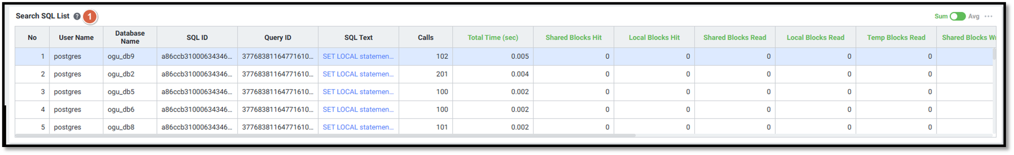| 2 | Toggle | 우측 상단의 토글 버튼 클릭을 통해 합계, 평균으로 변환할 수 있습니다. Total Time (sec) Shared Blocks Hit (cache hit) Local Blocks Hit (cache hit) Shared Blocks Read(disk read) Local Blocks Read (disk read) Temp Blocks Read(disk read) Shared Blocks Written (disk written) Local Blocks Written (disk written) Temp Blocks Written (disk written) Rows Block Read Time (sec) Block Write Time (sec) |