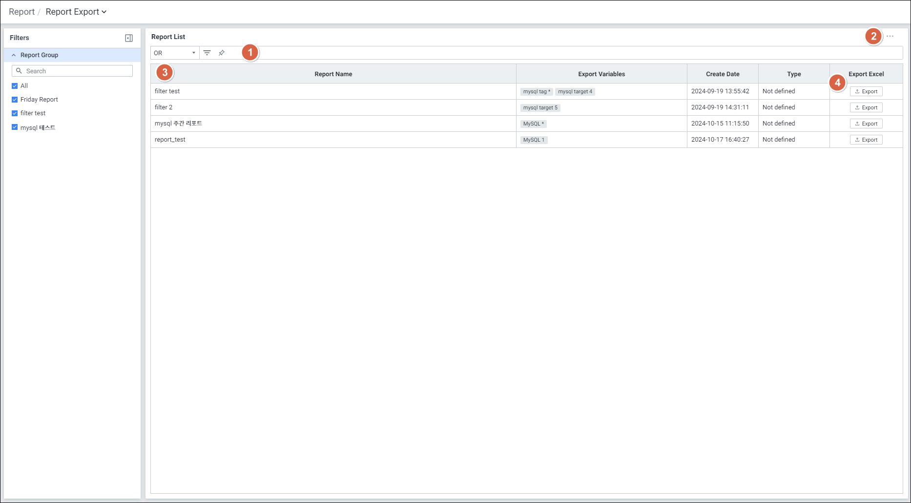 | 3 | Report List | Report List를 Grid 형태로 보여줍니다. Report Name Export Variables Create Date Type Export Excel |
