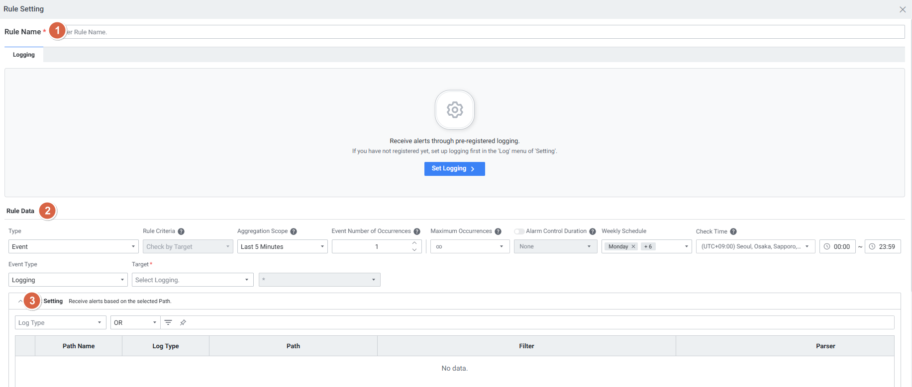 | 3 | Select Path | 알람을 설정할 Logging을 선택합니다. Setting > Log > Logging 화면에서 추가한 Logging 리스트가 출력 됩니다. |
