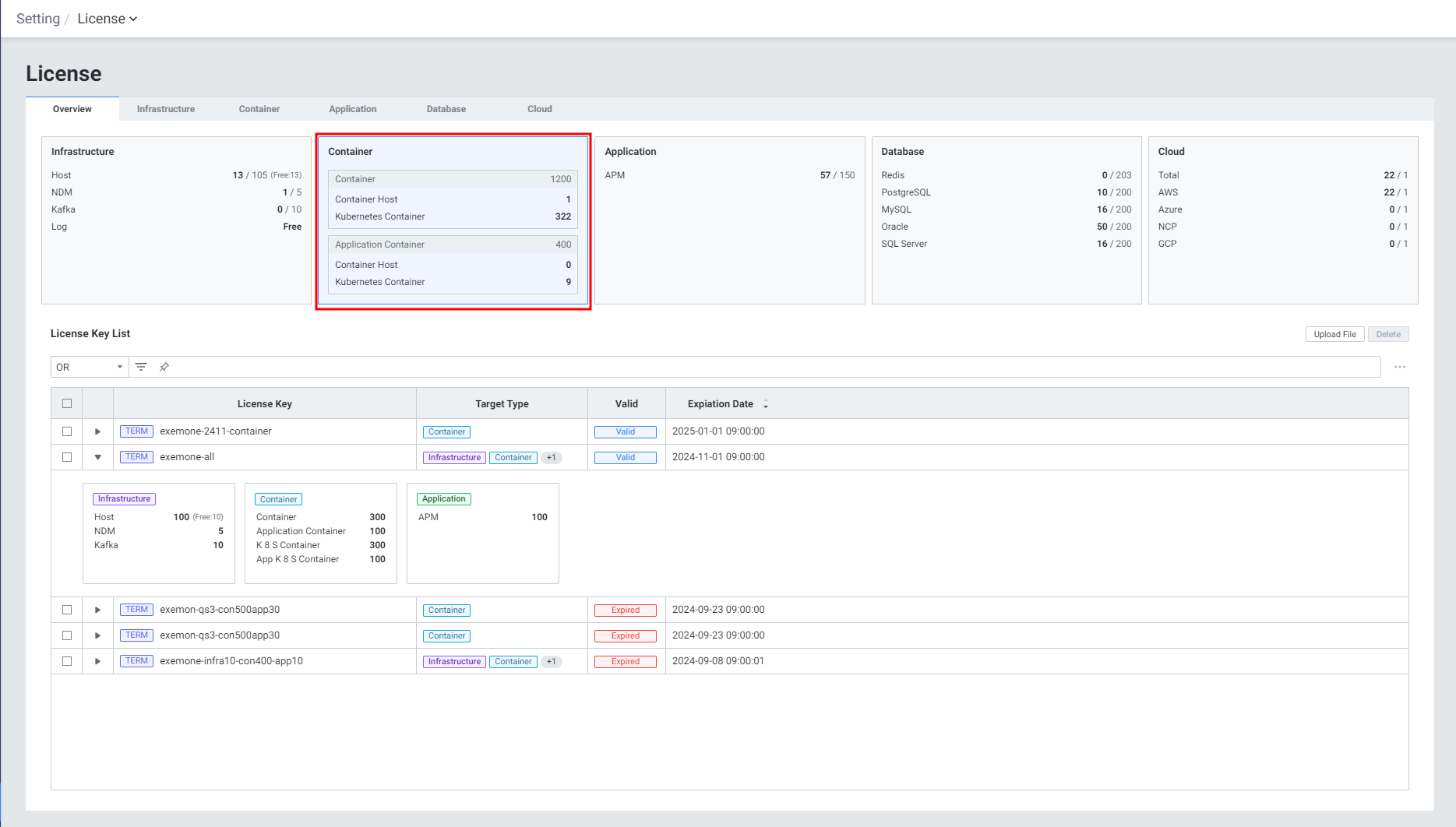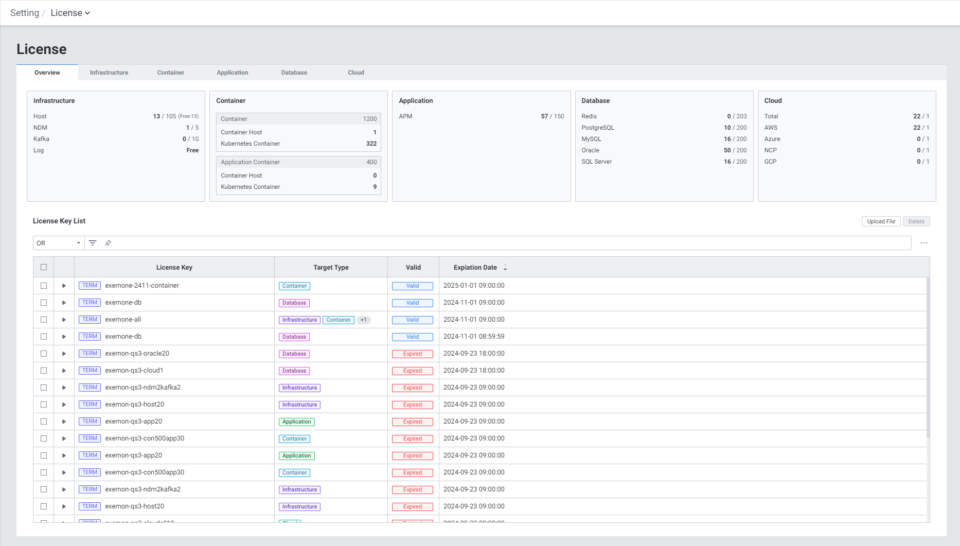 등록된 License 파일 정보와 적용된 타겟 정보를 확인할 수 있습니다.