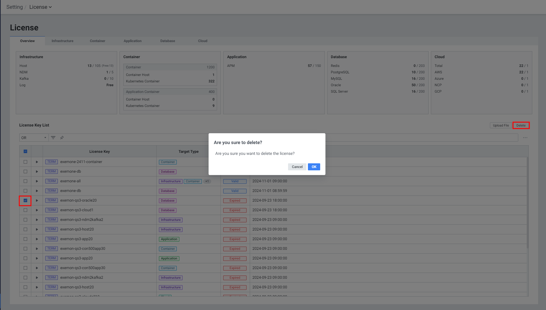 License Key List에서 삭제할 파일을 선택 후 [Delete] 버튼을 클릭하여 등록된 License 파일을 삭제 합니다.