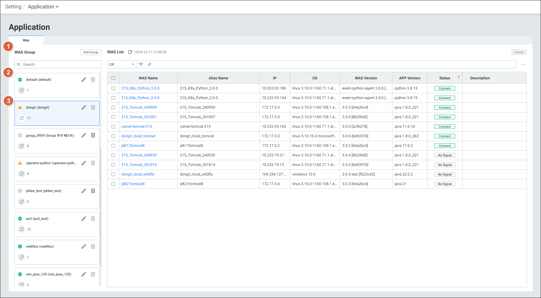 | 2 | Default | 기본 그룹입니다. 수정, 삭제 불가합니다. Range : WAS Range를 보여줍니다. 그룹당 500 으로 설정됩니다. Default 그룹 range: 1 ~ 500 |