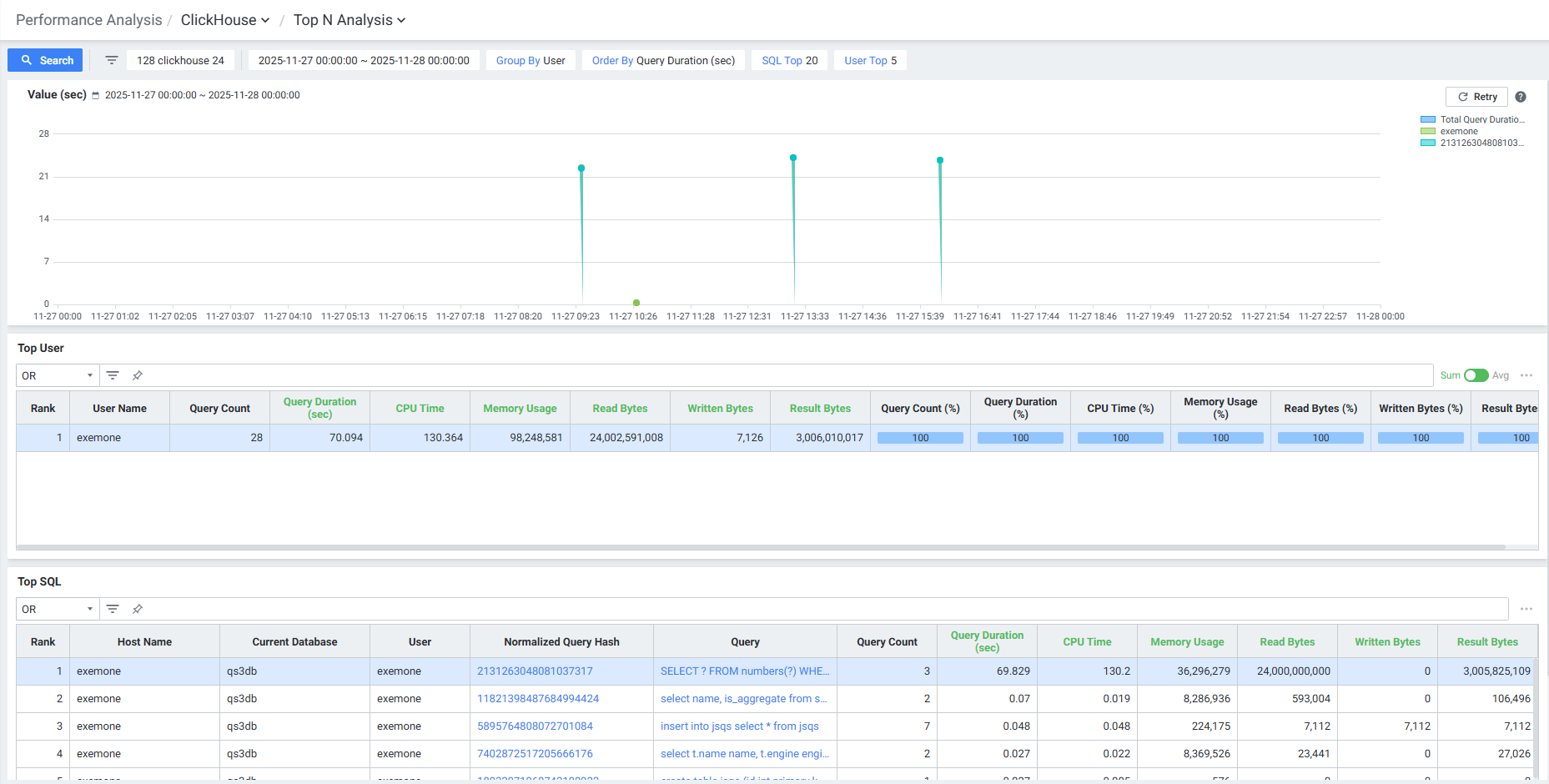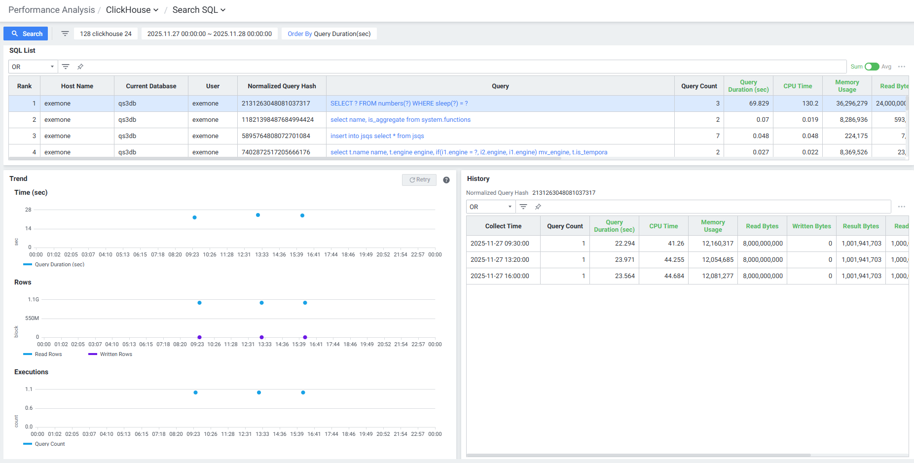주요 수집 항목: Hostname, Current Database, User, Normalized Query Hash, Query, Query Duration, Query Count, CPU Time, Memory Usage, Read Rows, Read Bytes, Result Rows, Result Bytes