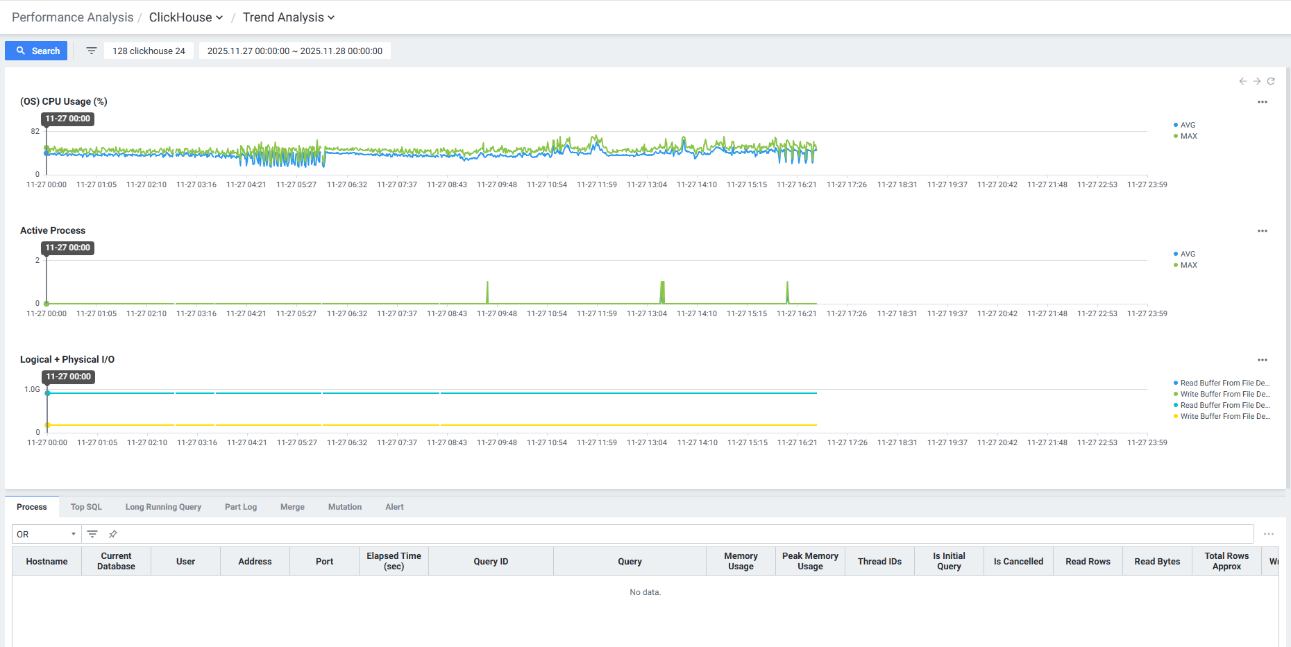 날짜 별, 시간 별 성능 추이 확인이 가능한 화면으로, 특정 시점의 정밀한 성능 분석 기능을 제공합니다.