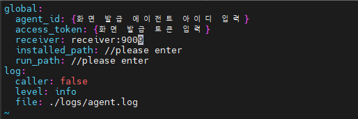 설치 완료 후 conf/agent.yaml 파일에 Agent ID, Access Token, Receiver 정보를 입력합니다.
