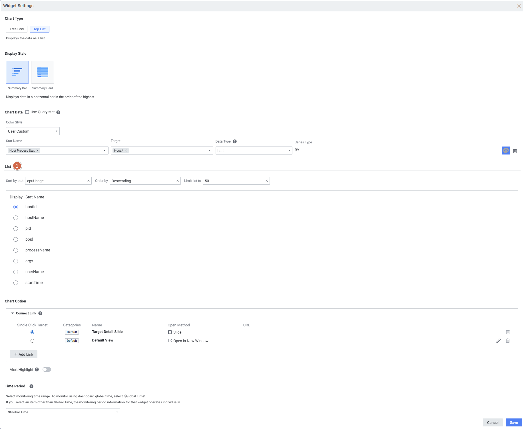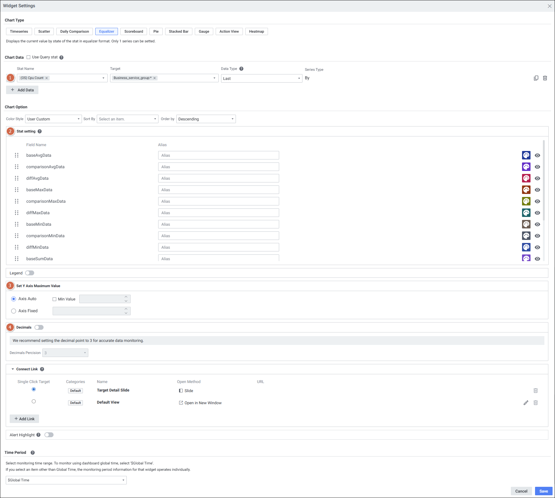 | 2 | Stat setting | 선택한 지표의 데이터를 표시합니다. 데이터 속성이 'Number'인 경우만 표시됩니다. 드래그로 순서 변경, Alias/색상 변경, 목록 숨김이 가능합니다. |