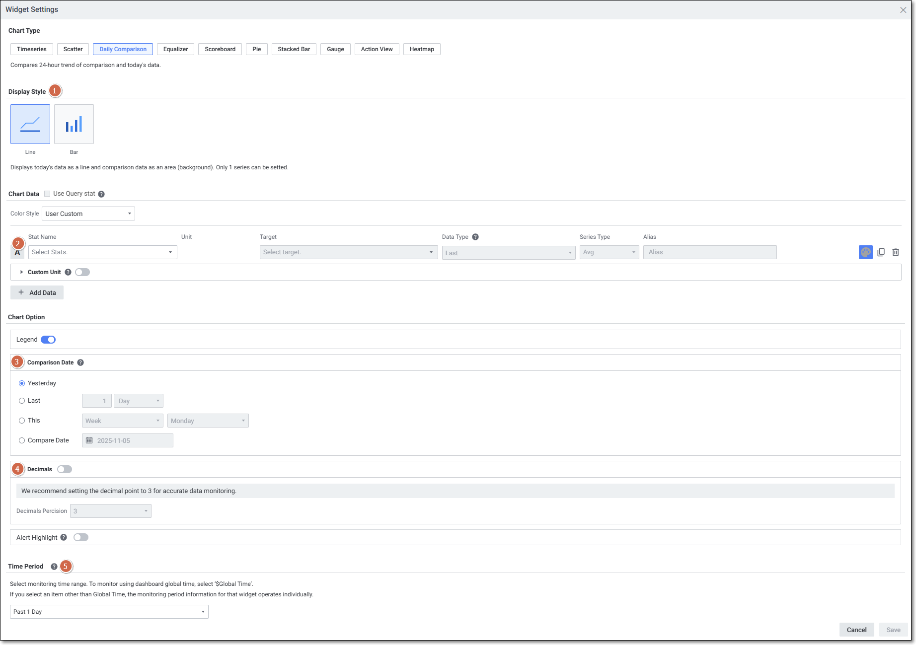 | 1 | Display Style | 차트 형태를 선택합니다. (Line / Area / Bar / Stacked Area / Stacked Bar) |