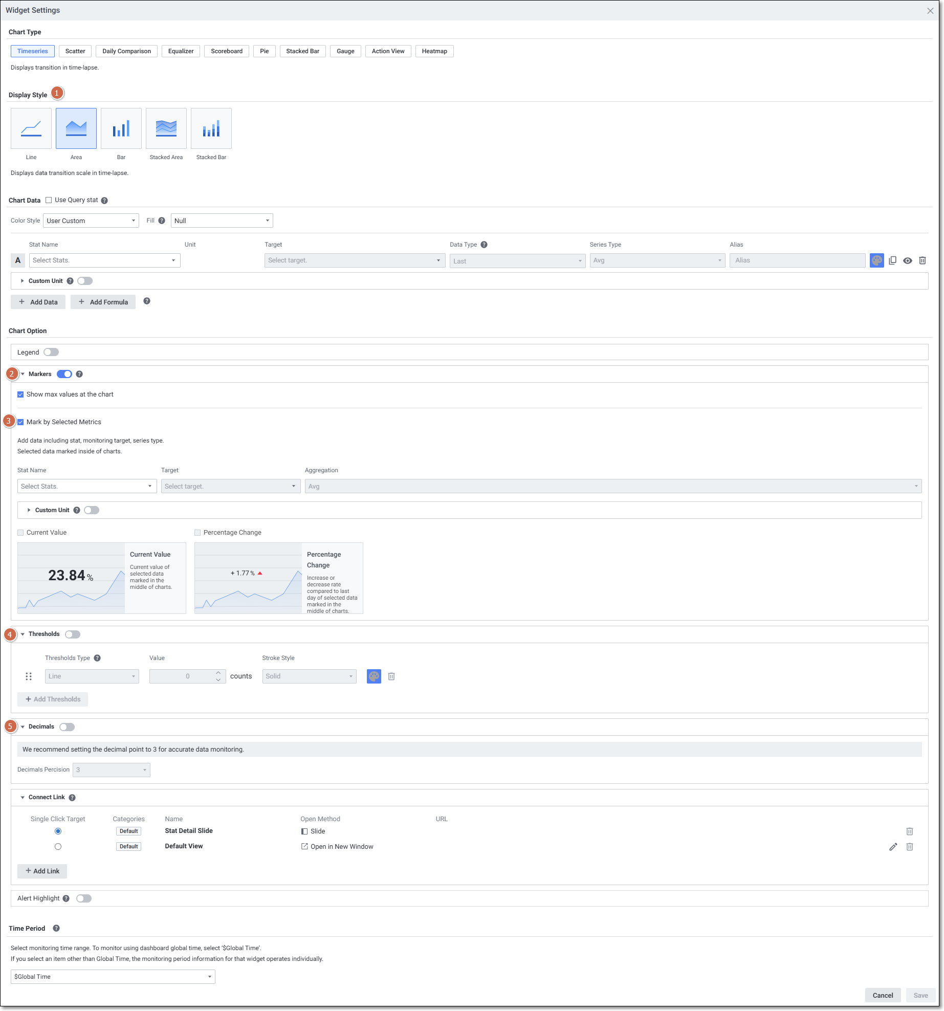 | 3 | Mark by Selected Metrics | Display Style이 Area일 때 표시됩니다. Stat, Target, Aggregation을 설정한 데이터의 Current Value, Percentage Change를 선택합니다. |