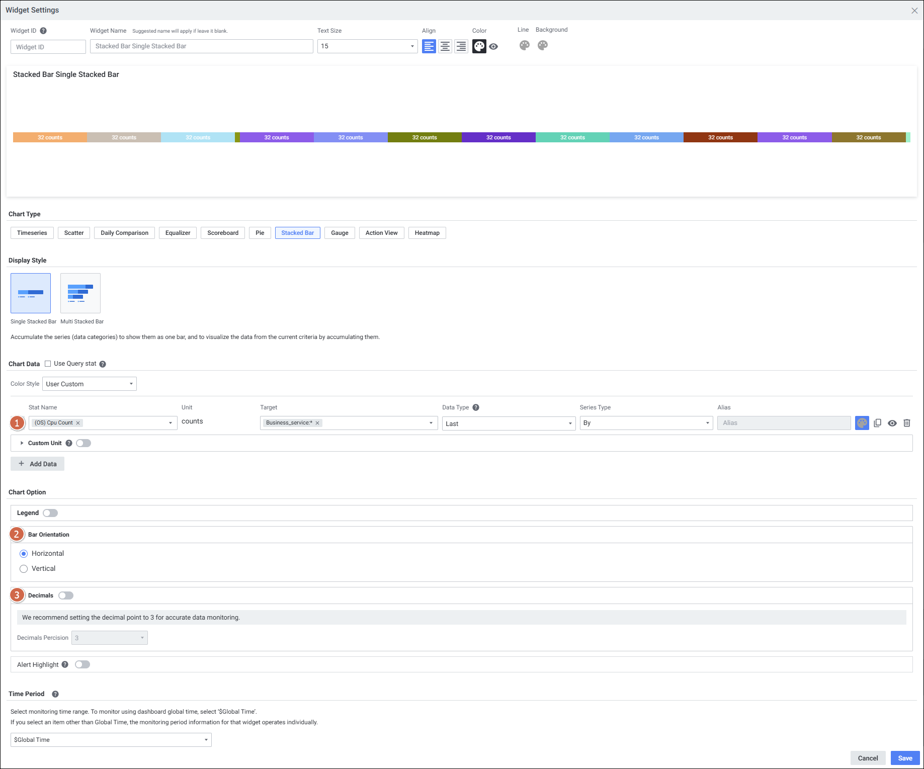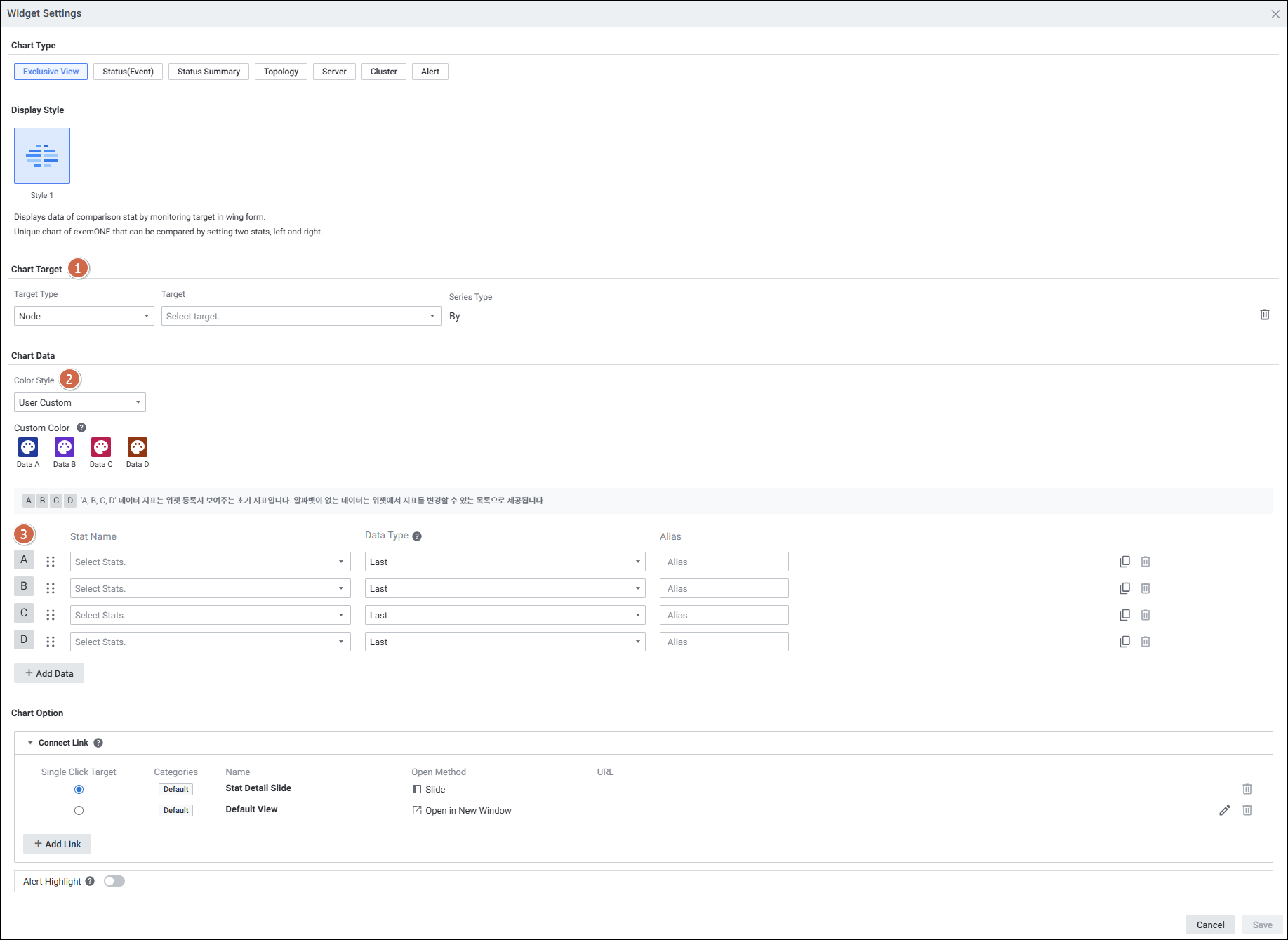 | 3 | Chart Data | 위젯에서 지표 목록으로 제공할 데이터를 선택합니다. 선택한 Target Type과 일치하는 지표를 선택해야 데이터가 표현됩니다. A, B, C, D 데이터는 삭제 불가합니다. |