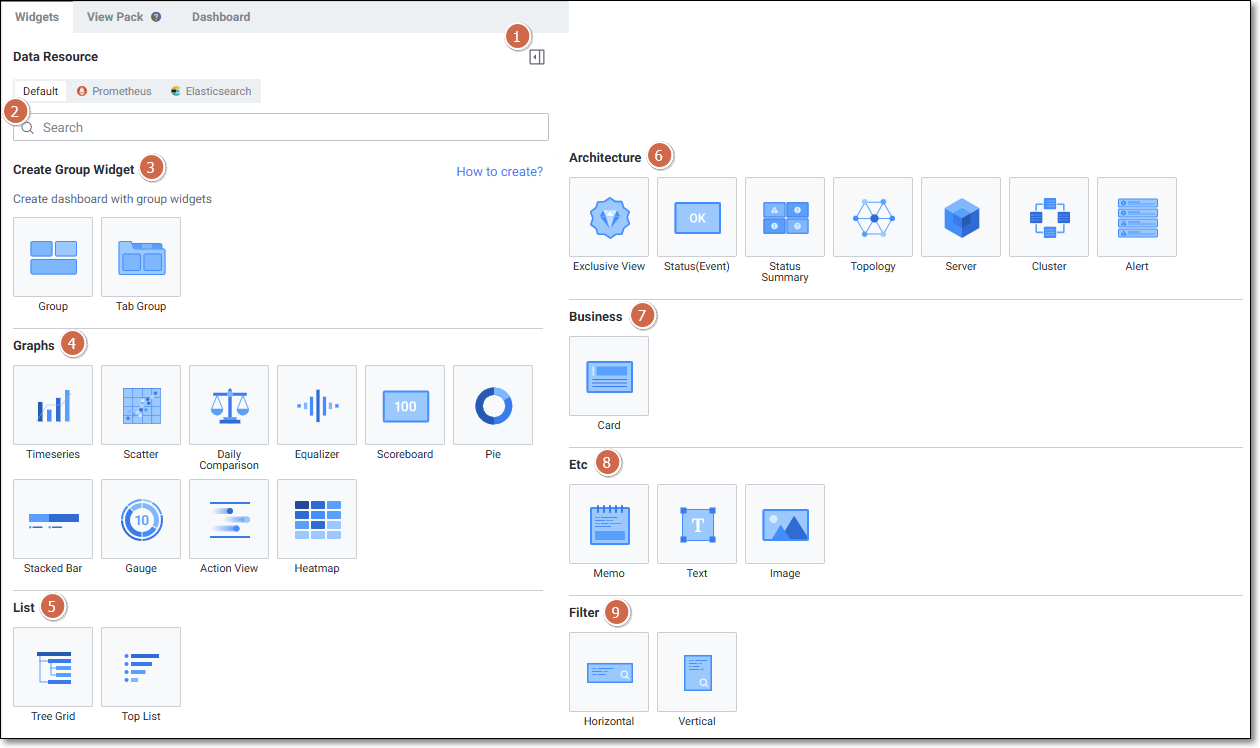 | 1 | Widget Type | 위젯 타입을 선택합니다. (Graphs, List, Architecture, Business, Text, Image, Filter) |