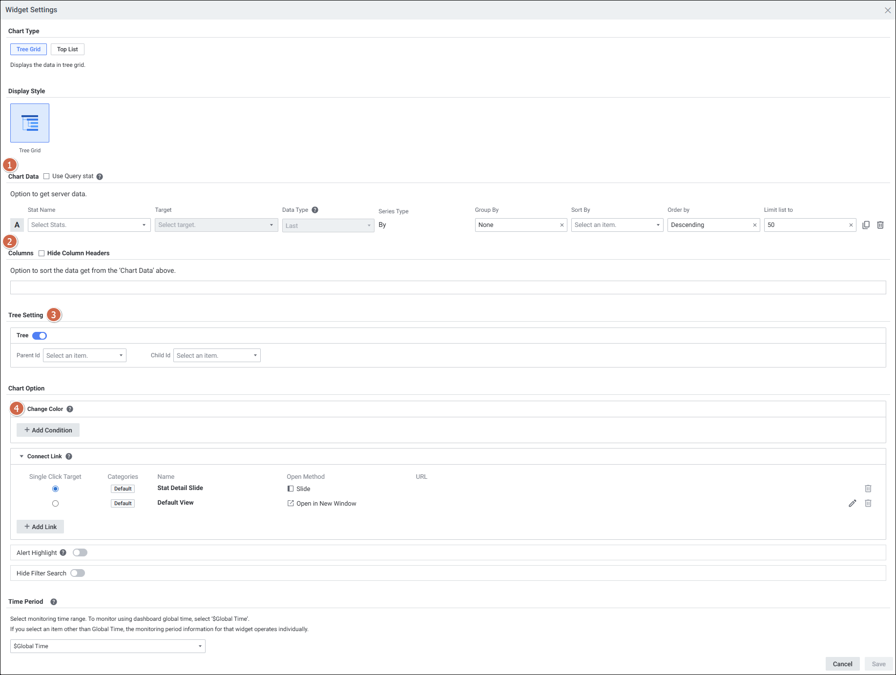 | 3 | Tree Setting | 리스트의 트리 구조화 기준에 대해 설정합니다. Parent Id : 트리 구조에서 부모로 지정할 ID 컬럼 선택 Child Id : 트리 구조에서 자식으로 지정할 ID 컬럼 선택 |