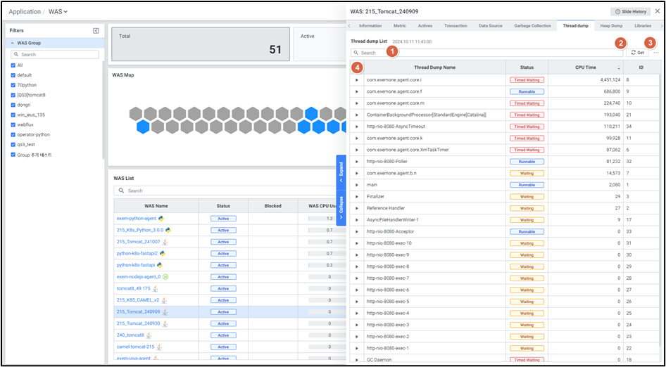 WAS 디테일 슬라이드의 스레드 덤프를 확인하는 화면입니다.