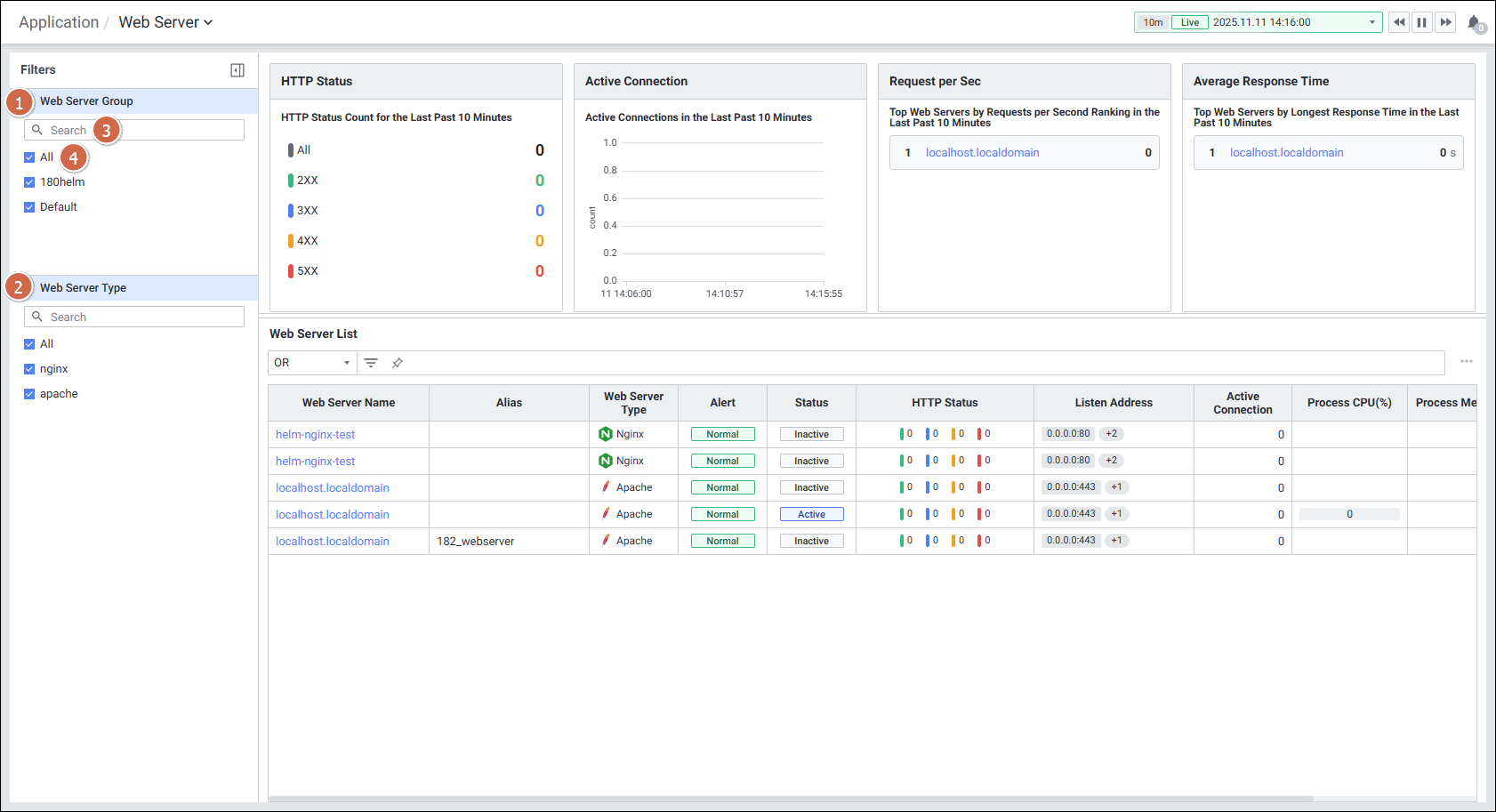| 2 | Web Server Type | Web Server Type 하위의 필터 항목을 보여줍니다. |