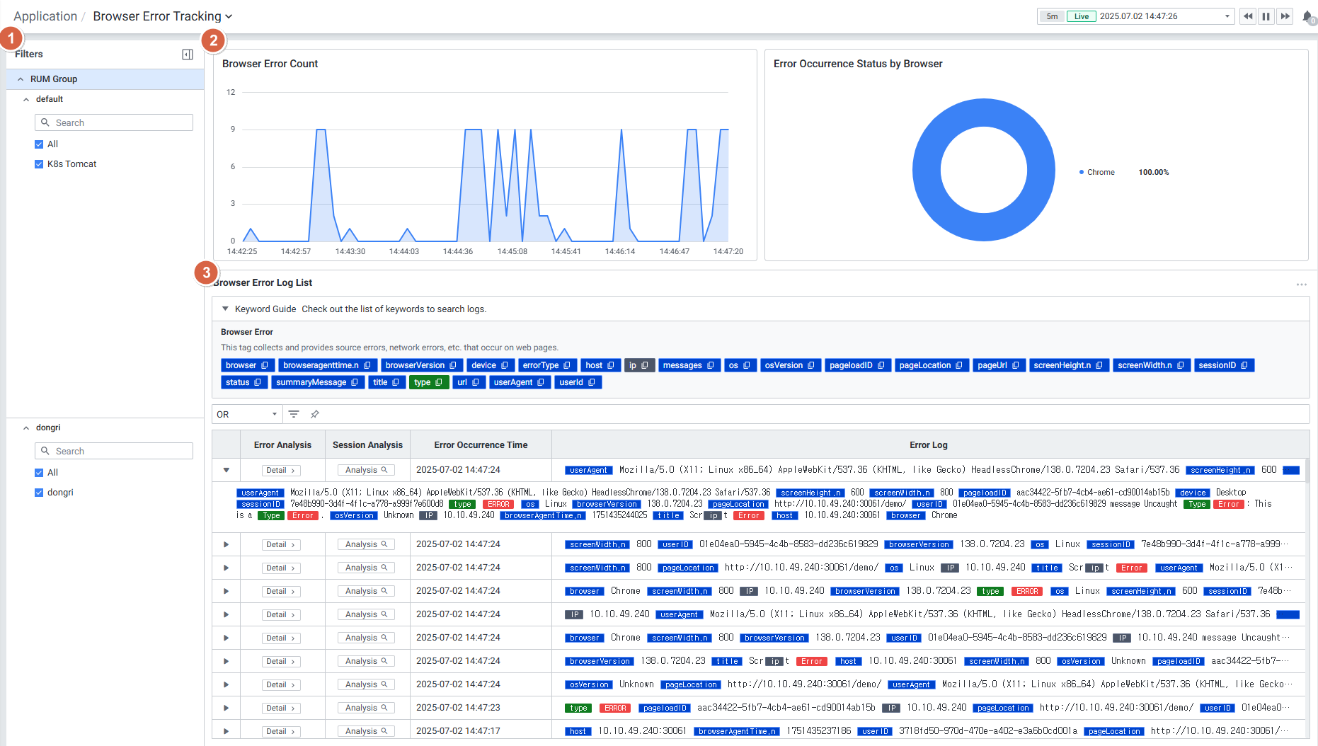 | 1 | Filter | Browser Error Tracking 화면의 Filters 항목을 선택합니다. |