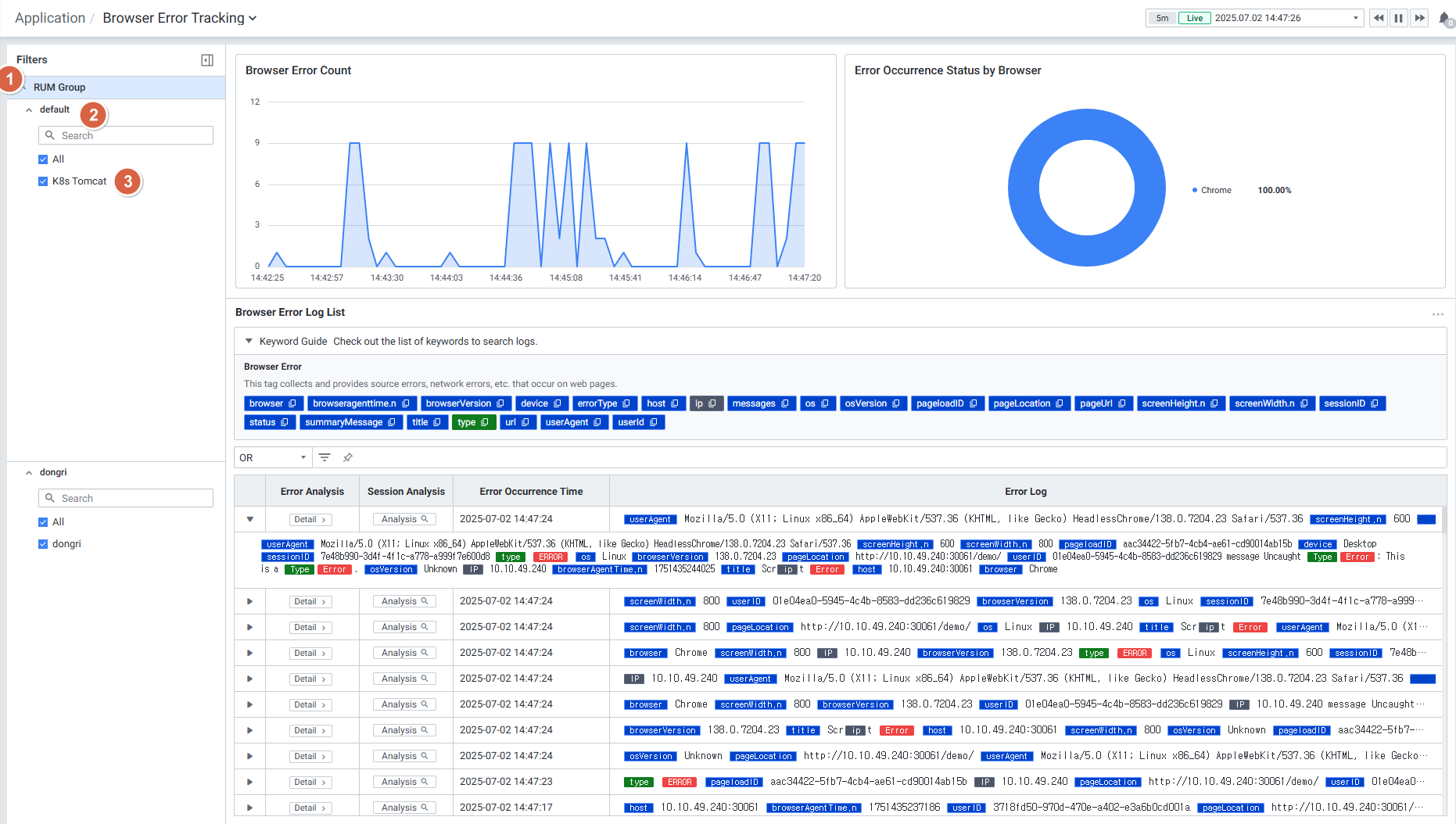 | 3 | Filter Item | 항목을 전체 선택한 상태로 보여줍니다. 필터 항목 선택에 따라 Browser Error Tracking 화면을 보여줍니다. 클릭 시 필터 항목을 접힌 상태로 보여줍니다. |